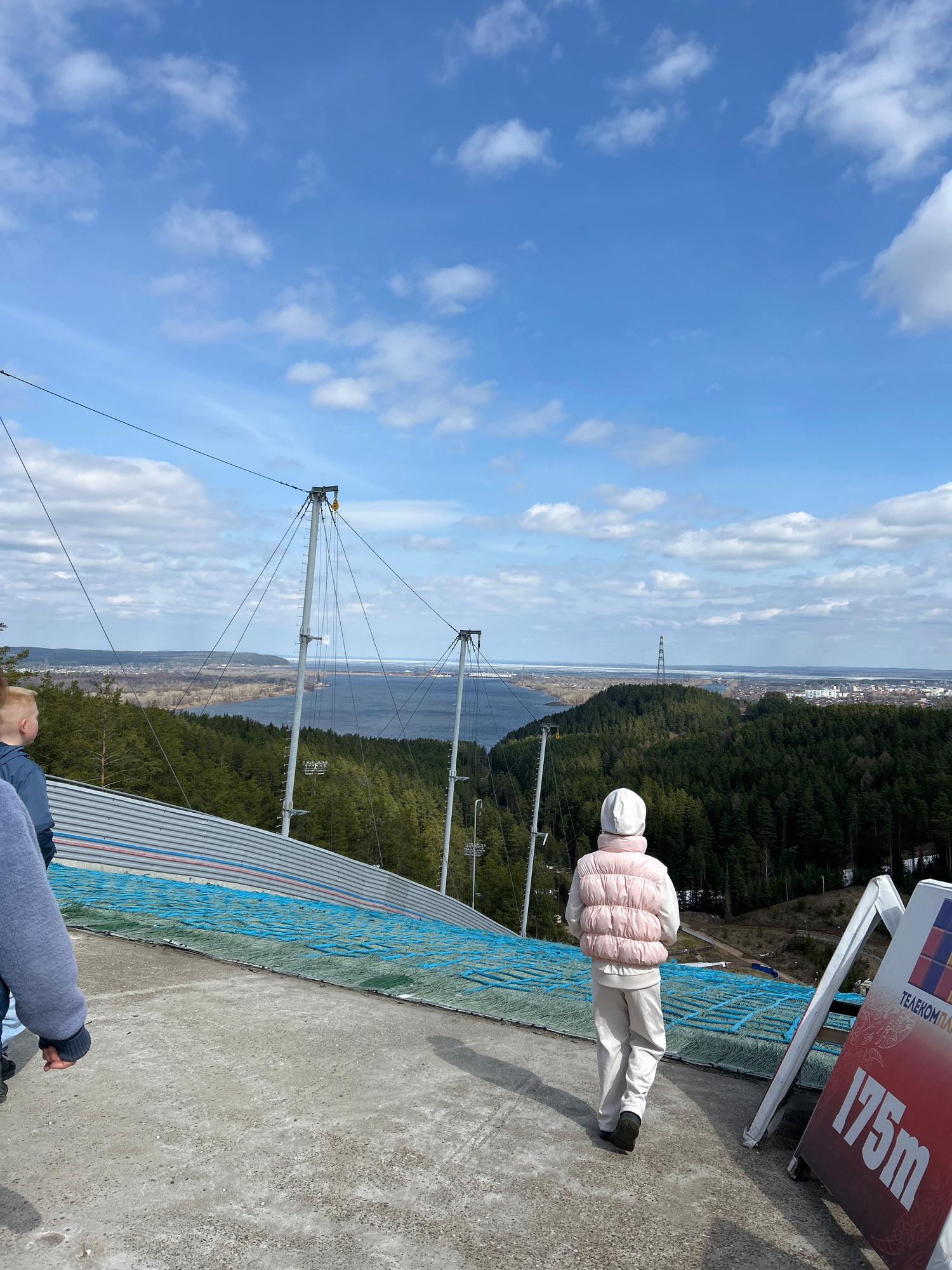 The image captures a panoramic view from the top of a ski jump structure, likely in the Прикамский (Prikamsky) region of Russia, on a bright, clear day with scattered white clouds. The perspective loo…read more