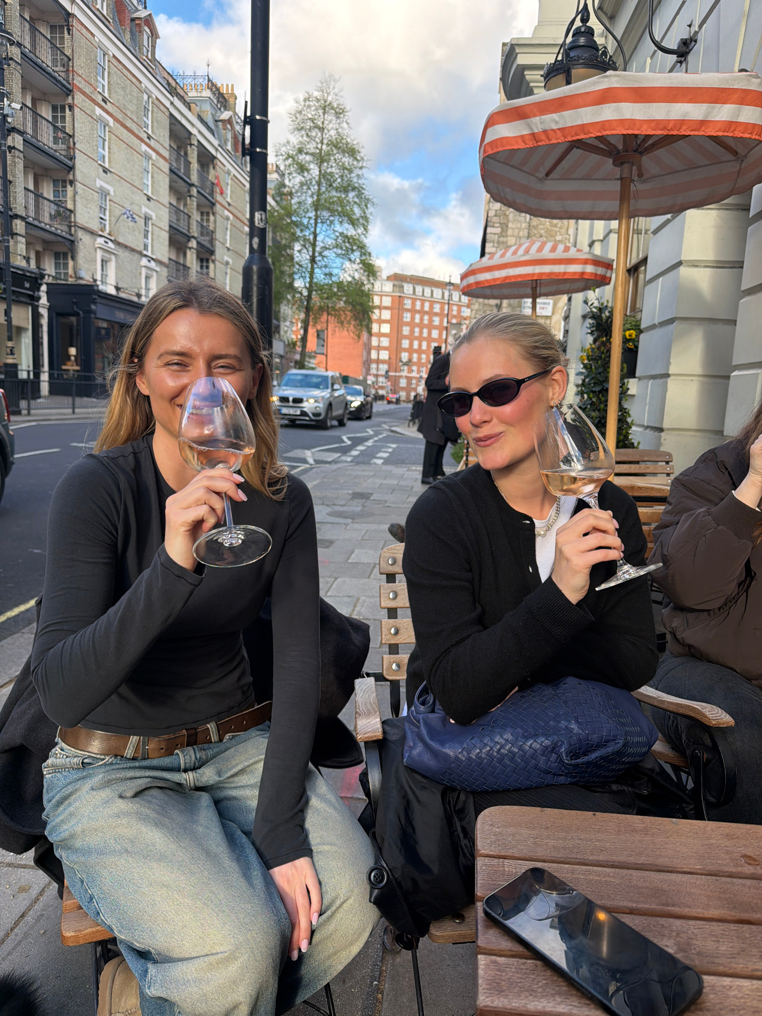 Two women are seated outdoors at a cafe. One woman wears a black cardigan and sunglasses. She holds a wine glass. Next to her on the table is a blue purse and a black phone. The other woman wears a bl…read more