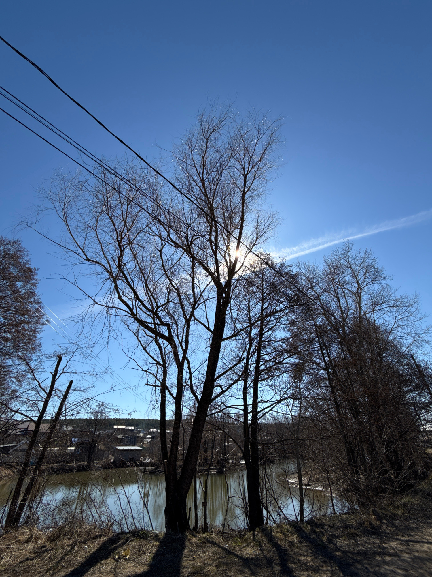 The image depicts a landscape with leafless trees silhouetted against a clear blue sky with a contrail. The sun shines through the branches, creating a starburst effect. Power lines are visible in the…read more