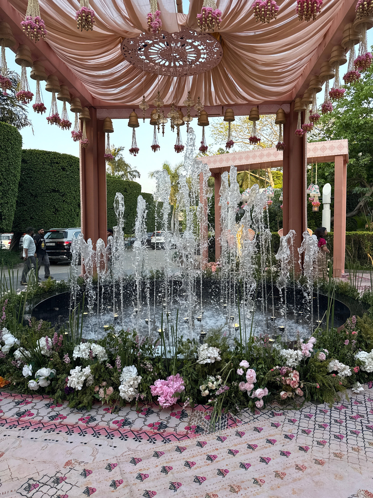The image depicts a wedding setup outdoors, likely in Delhi, India, based on the architectural and decorative styles. A canopy structure draped in light pink fabric with intricate detailing hangs over…read more