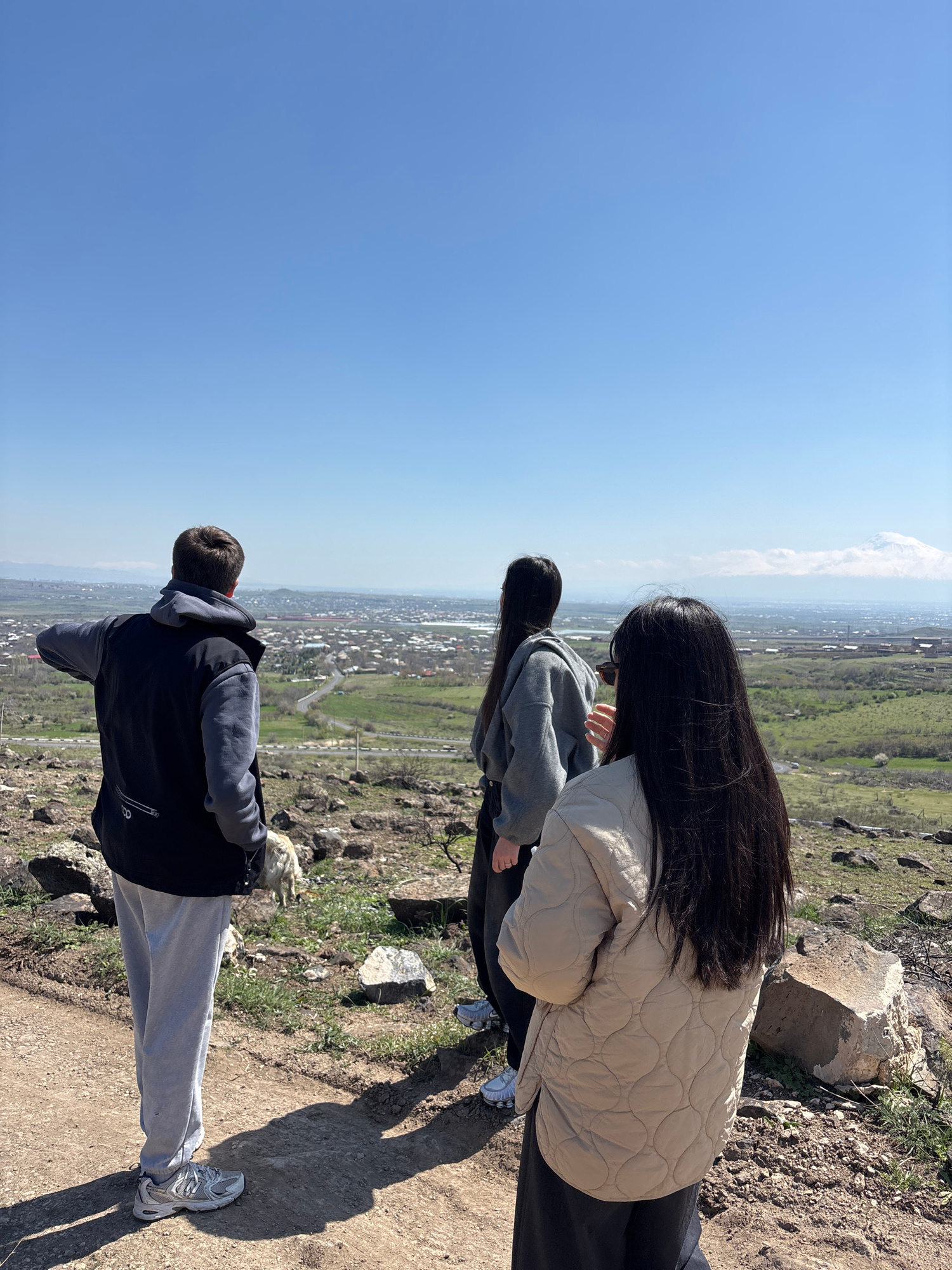A medium shot of three people standing on a rocky edge, looking out over a city and landscape. The person closest to the camera is a young man wearing gray sweatpants, white sneakers, and a black and…read more