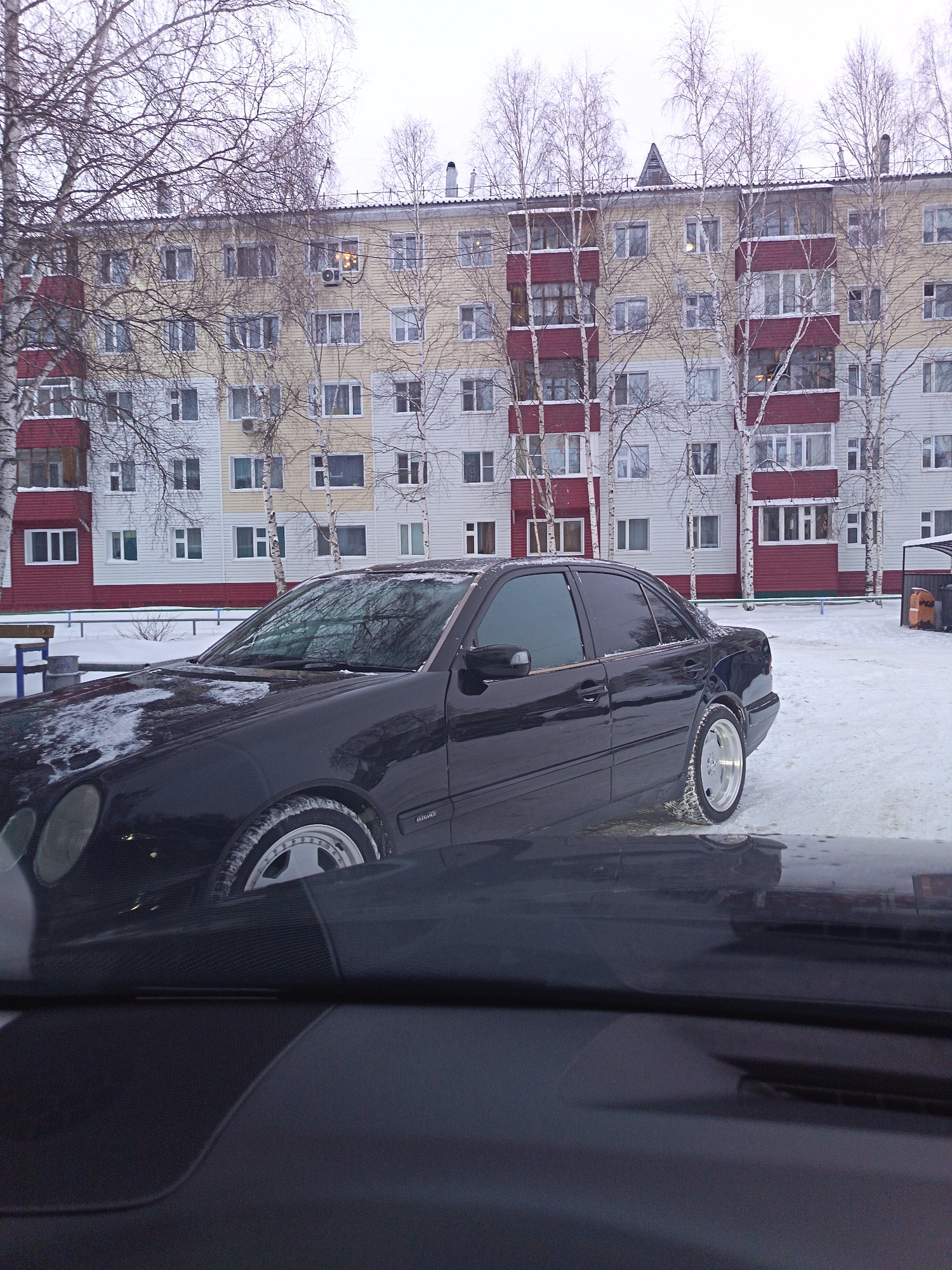 The image depicts a black Mercedes-Benz W210 parked in a snow-covered area in front of a multi-story residential building. The building has a facade with alternating bands of white, light yellow, andβ¦read more