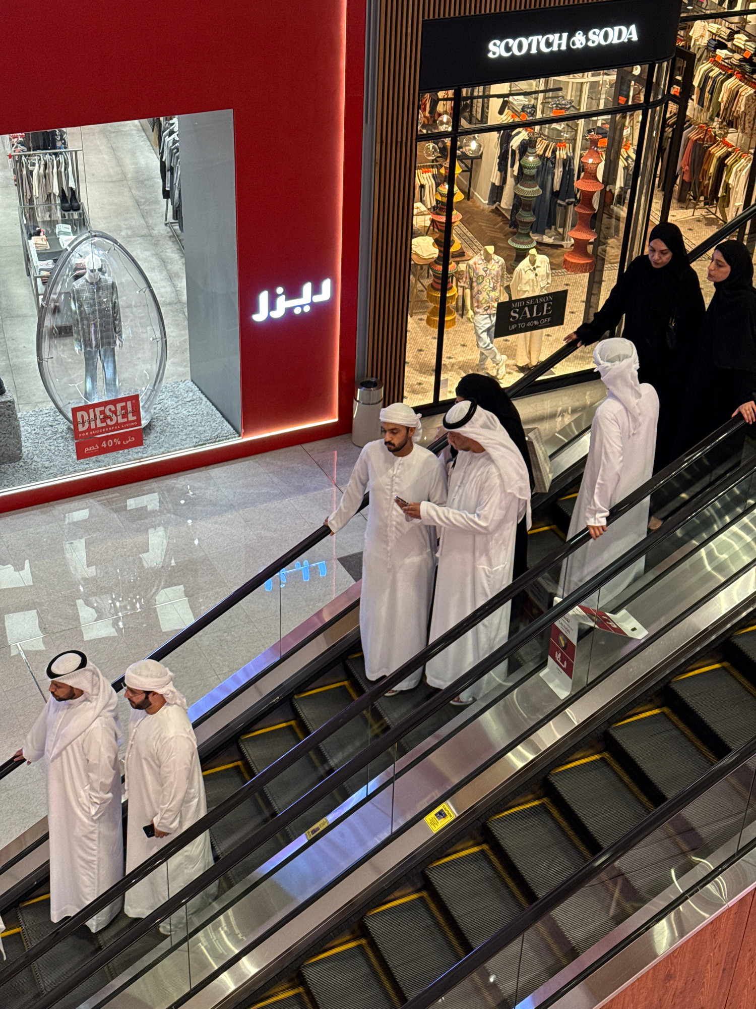 The image shows an escalator in what appears to be a shopping mall in Dubai, United Arab Emirates. Several individuals are riding the escalator. Two women dressed in black abayas and hijab are at the…read more