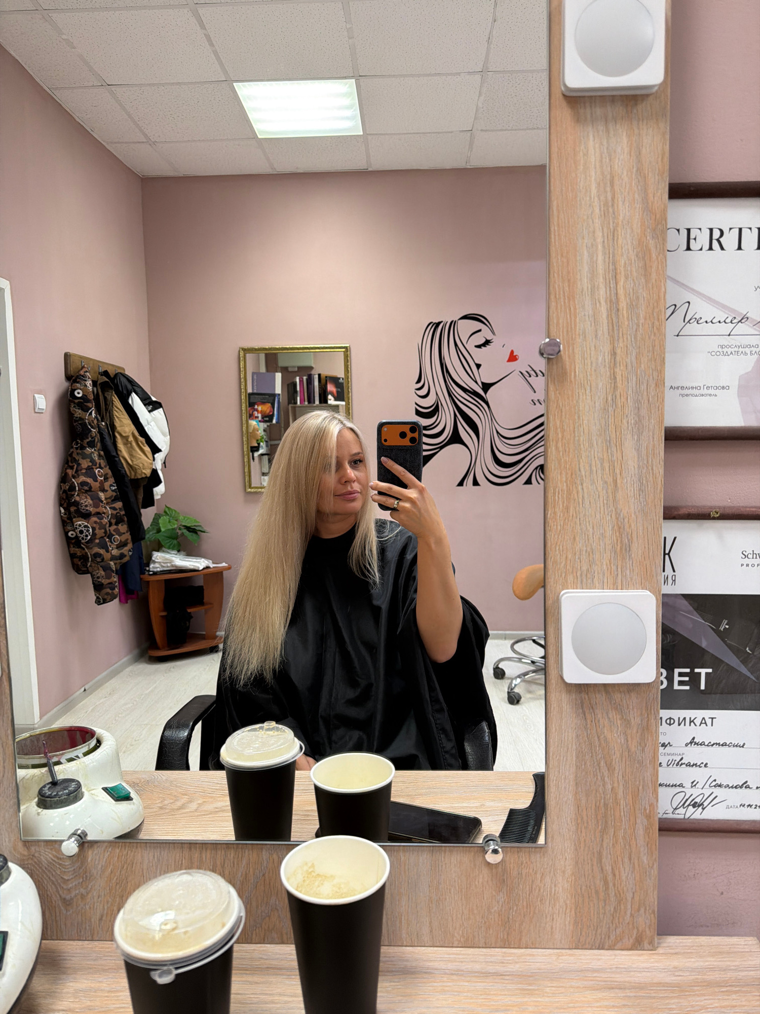 Here's a detailed description of the image: **Scene:** The image appears to be a reflection in a mirror inside a hair salon. It's likely the client is taking a selfie after having her hair treated. **People:** The main subject is a woman with long, blonde hair, wearing a black cape, typical of those used in salons. She is holding a smartphone and taking the selfie. **Objects:** * Hair salon setting: Includes a salon chair, a table with beauty equipment (possibly hair dye mixing machine and cups with product), and salon equipment on the table to the right of the mirror. * Wall decorations: The wall behind the woman is pink. There is a decorative stylized drawing of a woman's face on the wall as well as a framed piece of art. * Mirror details: The mirror has a wooden frame. There are certificates and other materials placed on a shelf above the mirror. * Clothing items: A pile of clothes is on a nearby table. **Actions/Interactions:** The woman is taking a selfie. The scene shows a hair transformation process or an 'after' shot in a salon. **Environment:** The salon is likely in a contemporary style with a light pink color scheme. The lighting is bright from overhead lights. **Location:** Given the OCR text contains Russian text, it is possibly in the city of Sarapul, Russia. The OCR text says “Ангелина Гетаова преподаватель” which means “Angelina Getanova teacher”. | Open Wire
