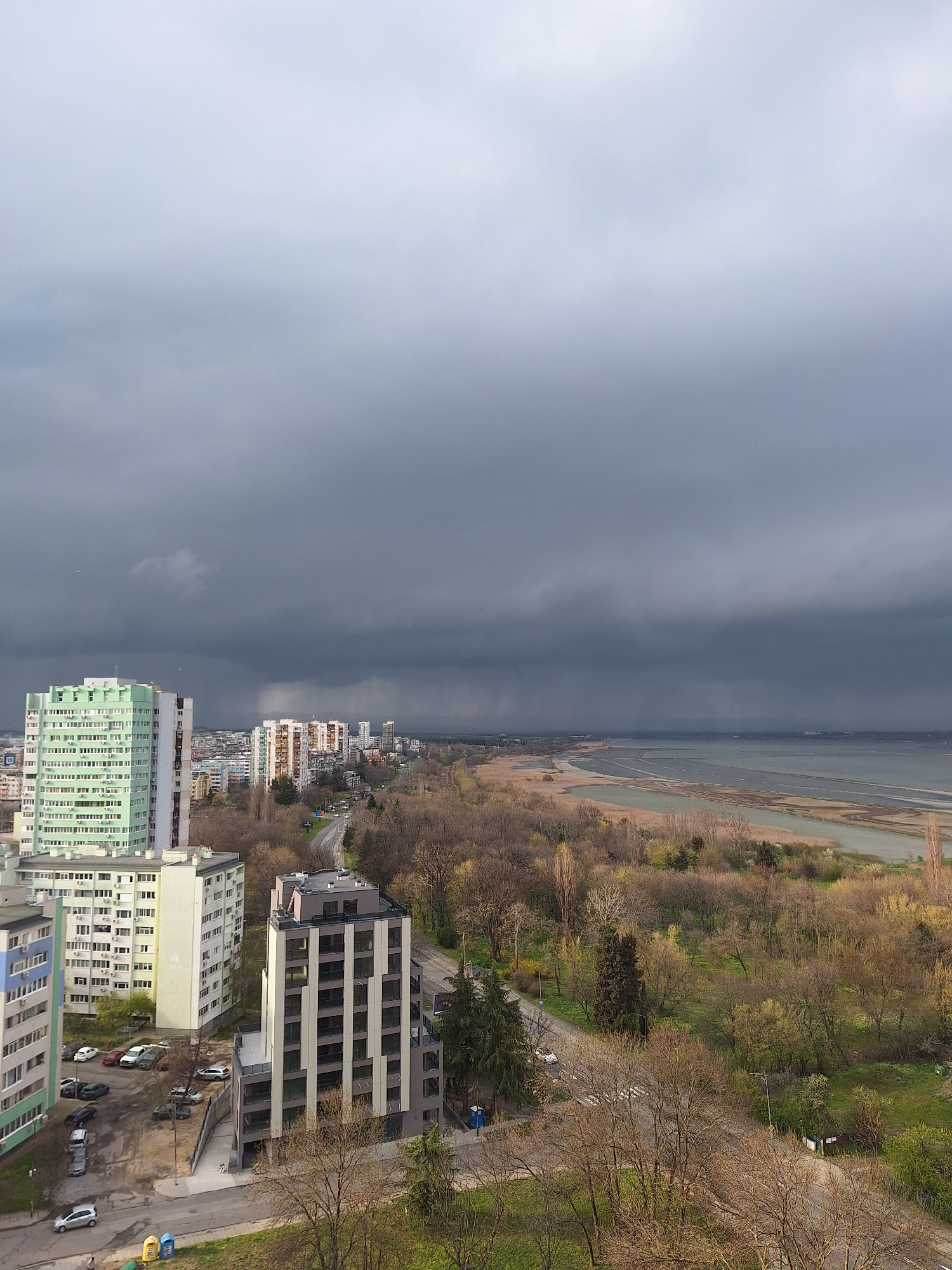The image presents an elevated, possibly aerial, view of a cityscape on the Black Sea coast, likely within the city of Burgas, Bulgaria. A dramatic weather system divides the scene: a dark, stormy sky…read more