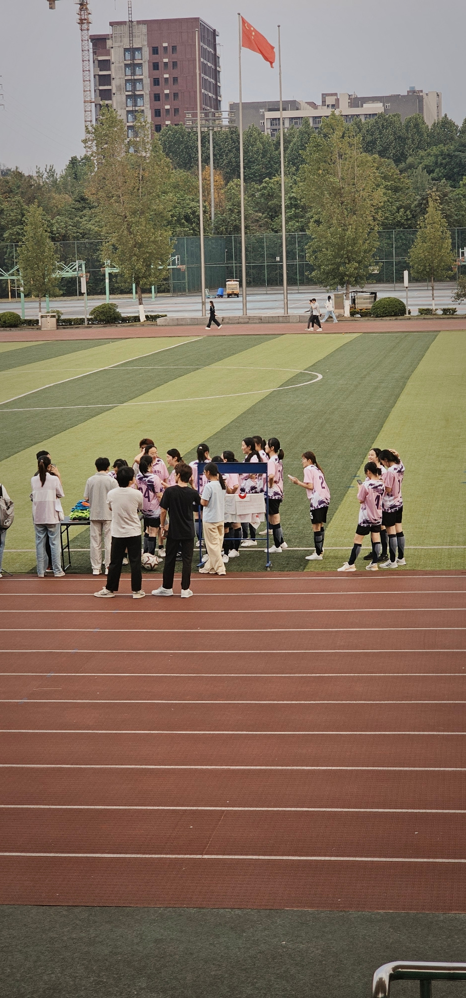The image captures an outdoor sports complex, likely a university or school campus, situated in the Chongqing High-tech Zone, China. The scene features a vibrant green artificial turf soccer field bor…read more
