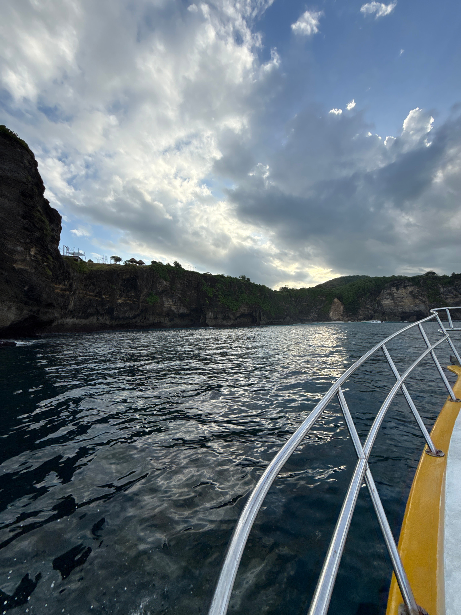From the vantage point of a vessel, the image captures a dramatic coastal scene. To the left, a formidable cliff face, partially shrouded in verdant vegetation, plunges into the dark, rippling water.…read more