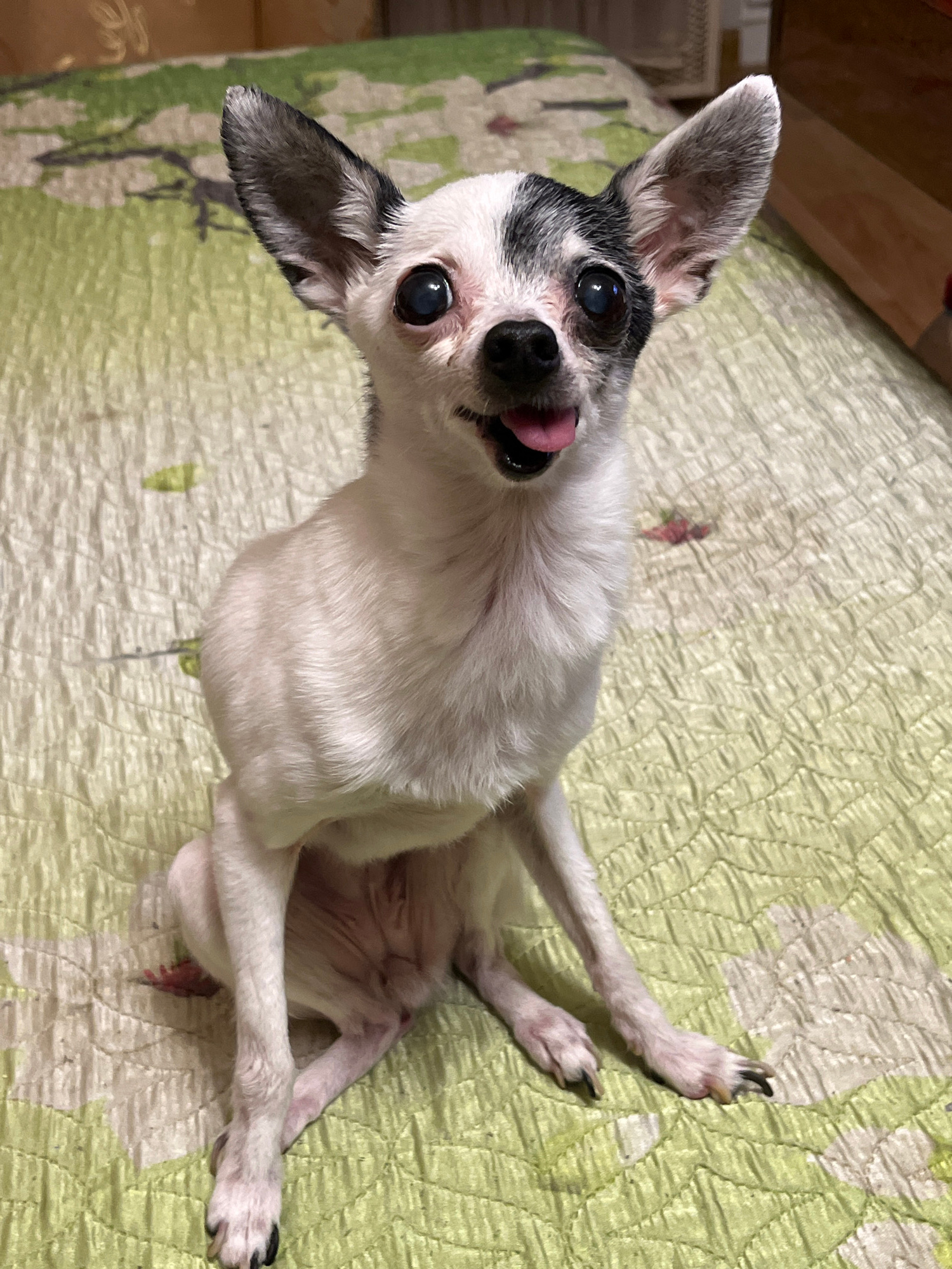A small, white dog with black markings around its eyes and ears is lying on a green, textured surface. The dog is looking up at the camera with its tongue sticking out. Its legs are splayed out to the…read more