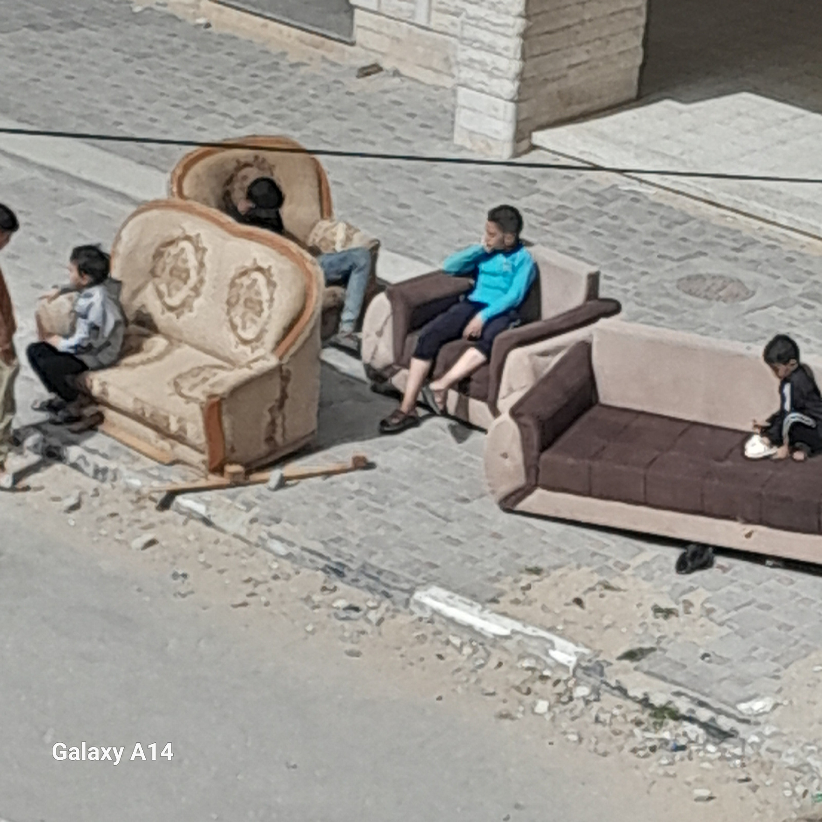 The image depicts an outdoor scene in what appears to be a street or alleyway, captured from an elevated viewpoint. Several individuals, primarily children and young adults, are gathered among discard…read more