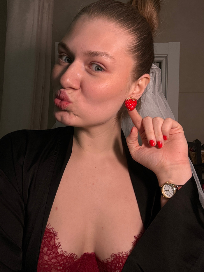 The image displays an adult female subject in an indoor, dimly lit setting in Kazan, Russia. Her light-colored hair is styled in an updo. She looks directly at the viewer with blue eyes, her lips purs…read more