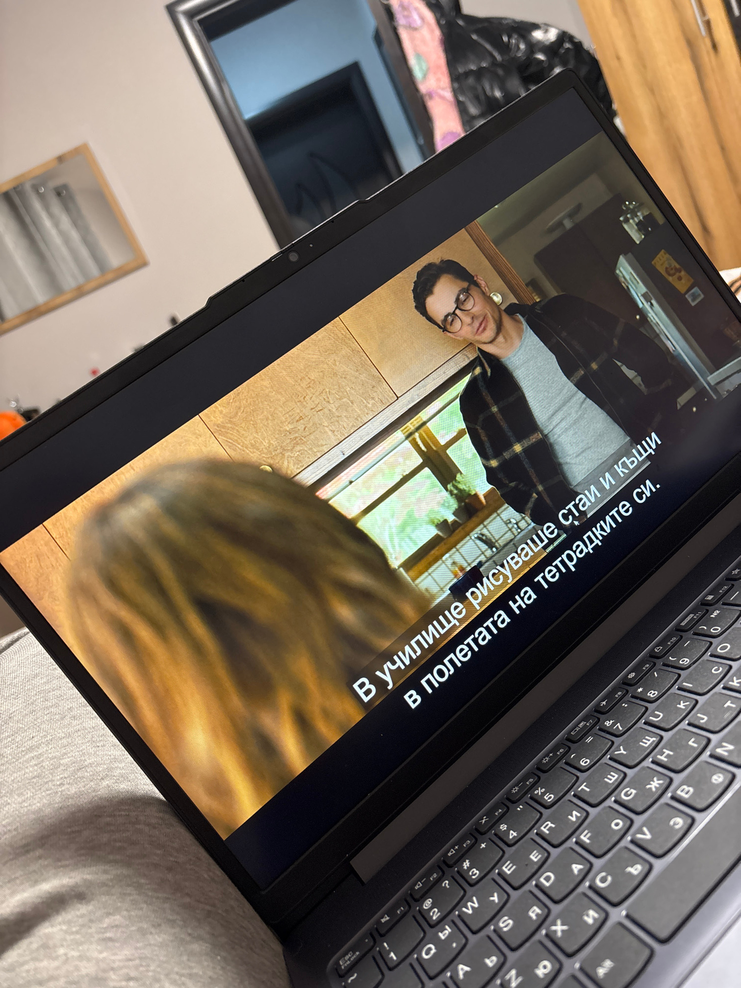 A laptop displays a scene of a man wearing glasses and a plaid shirt with Russian subtitles. The keyboard of the laptop is visible. The setting appears indoors, potentially in a home, with a glimpse o…read more