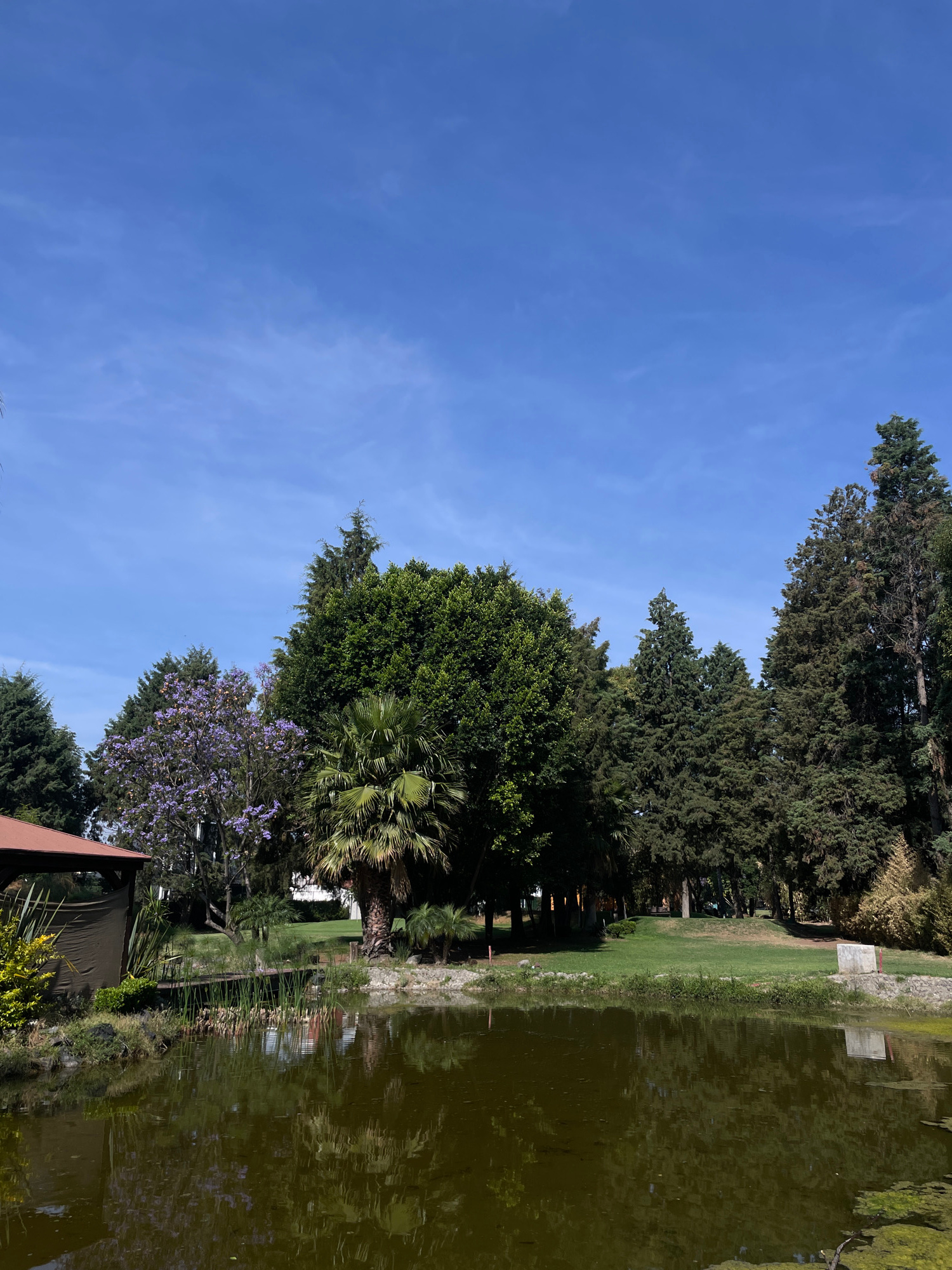 The image captures a park scene, likely in Cholula, Mexico, given the architectural styles and vegetation common in the region. A body of water, potentially a pond or small lake, fills the right side…read more