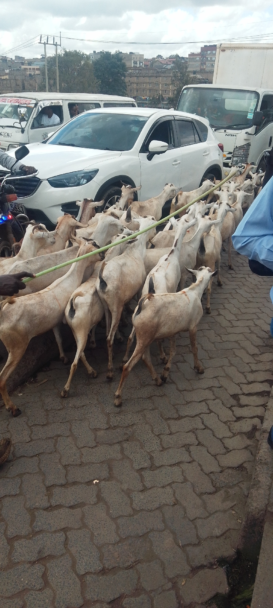 A flock of goats is being herded along a brick-paved street in Nairobi, Kenya. The goats are mostly white with some brown markings, and they are crowded together, with a herder guiding them using a gr…read more