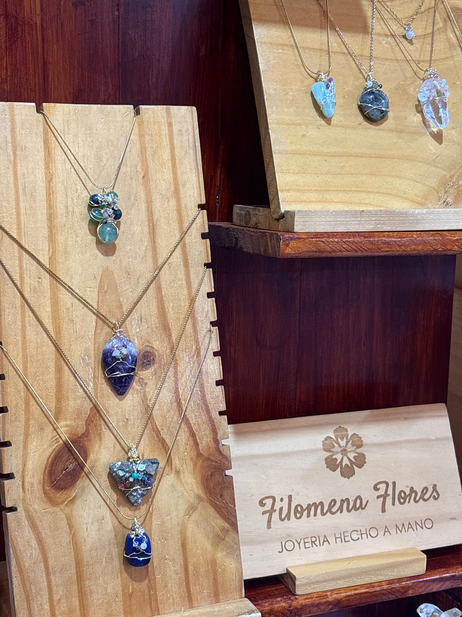 The image depicts a close-up view of jewelry displayed for sale, likely at a craft fair or artisan market. The location can be determined by the brand name etched on a wooden block, "Filomena Flores,…read more