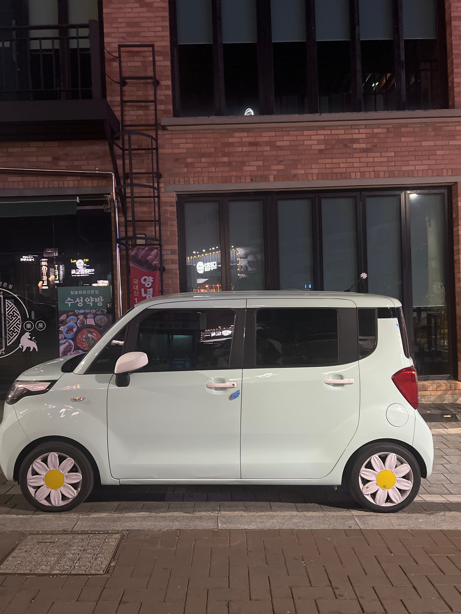 A white compact car with white flower-shaped wheel covers is parked on a brick sidewalk alongside a brick building. The building has large, multi-pane windows with dark frames. The car's passenger sid…read more