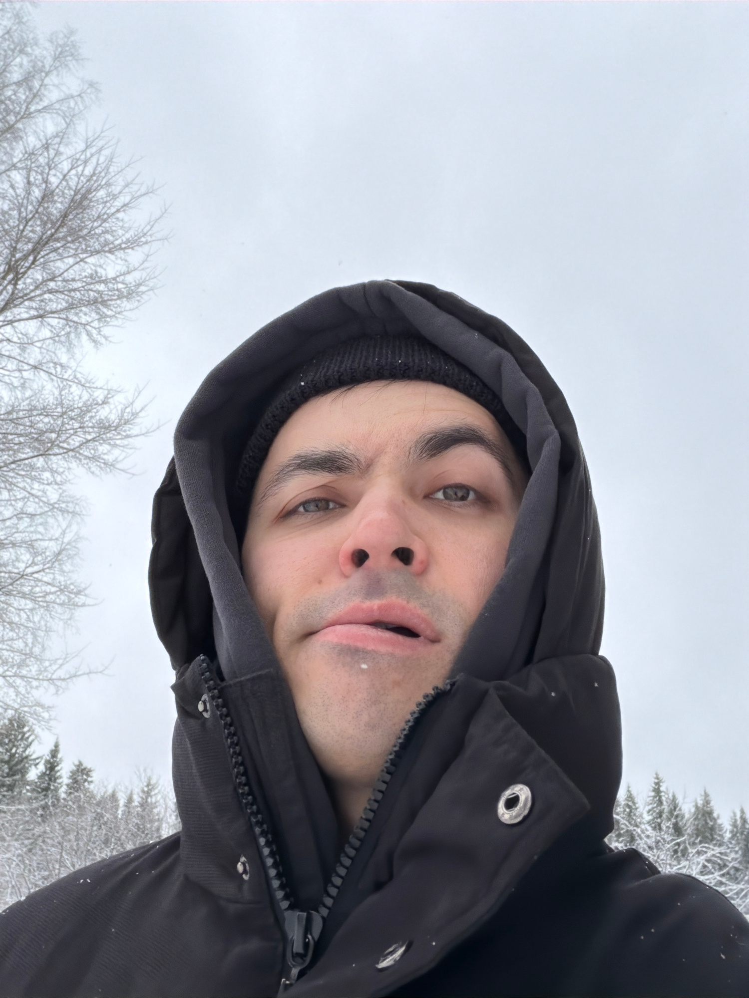 A close-up, low-angle shot depicts a person in a black hooded winter jacket and a black beanie. The person's face is visible, revealing light skin, gray eyes, and stubble. Their mouth is slightly openβ¦read more