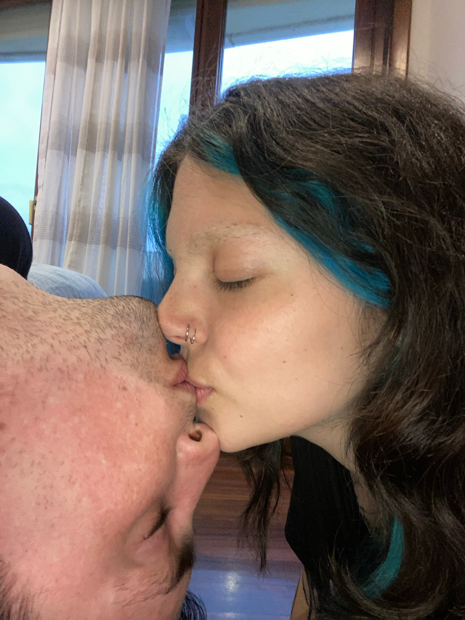 A couple is kissing indoors. The woman has dark brown hair with a streak of blue near her face and a double hoop earring in her nose. The man has short, dark hair and stubble. A window with partially…read more