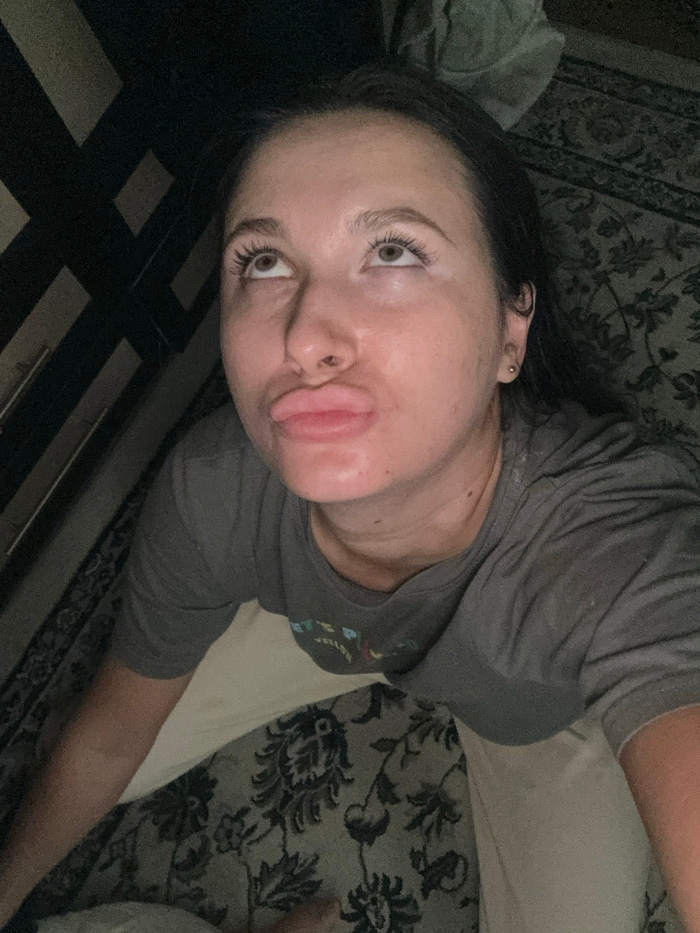 A woman lies tilted against patterned textiles, seemingly a rug and a bedspread. She wears a gray shirt and light pants. Her face is close to the camera, featuring full lips and long eyelashes. Her da…read more