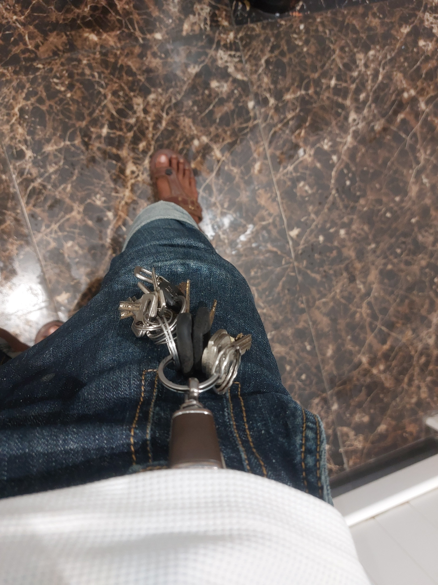 A person wearing jeans and a white shirt is standing on a brown marble-patterned floor. A set of keys hangs from the person's right front pocket. The person is also wearing sandals, exposing their fee…read more