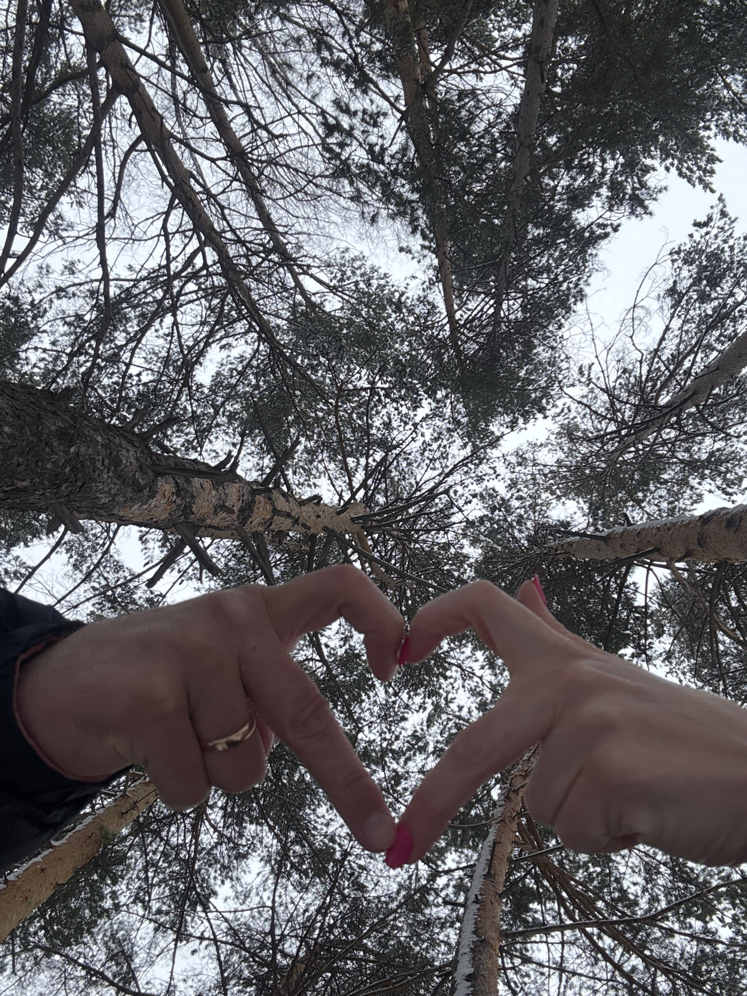 A view from below looking upwards shows a forest scene, likely in the city of Chaikovsky, Russia, given the context. Trees with snow or frost on their branches fill the frame, with the sky visible thr…read more