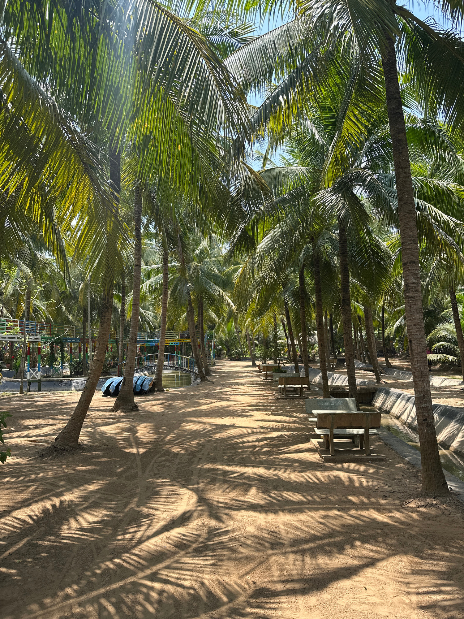A photo of palm trees along a sandy path in Tân Thạch, Vietnam. The trees cast shadows on the ground, and there are picnic tables along the path. A few boats are visible near the base of some of the t…read more