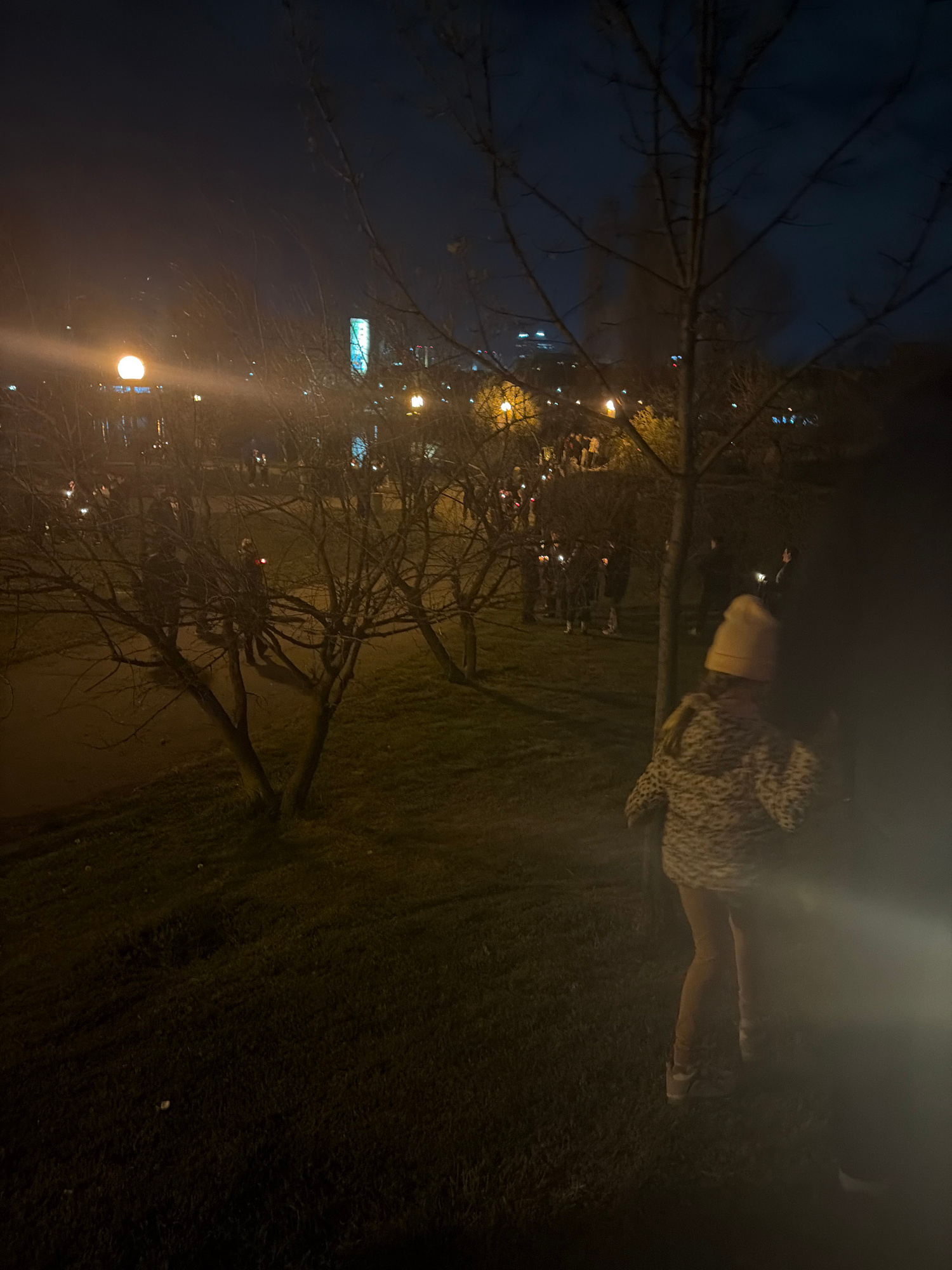 At night, in what appears to be a park in Sofia, Bulgaria, a person wearing a patterned jacket and light-colored hat is seen, facing away from the camera. In the background, blurred lights suggest a c…read more