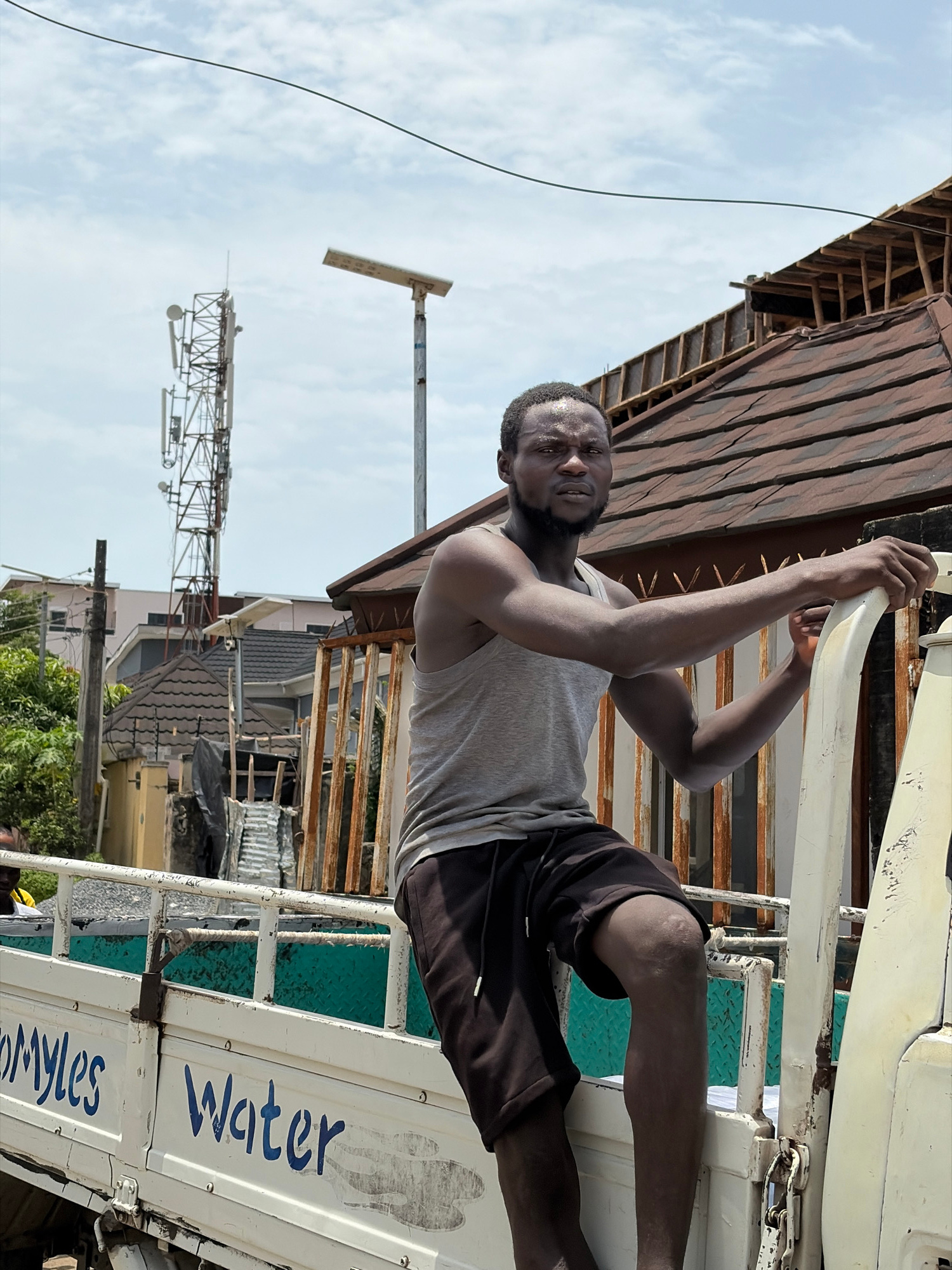 A man in a grey tank top and dark shorts is positioned on the side of a white truck with "Myles Water" written on it. He is gripping a white bar, appearing to climb onto or off the vehicle. The backgr…read more