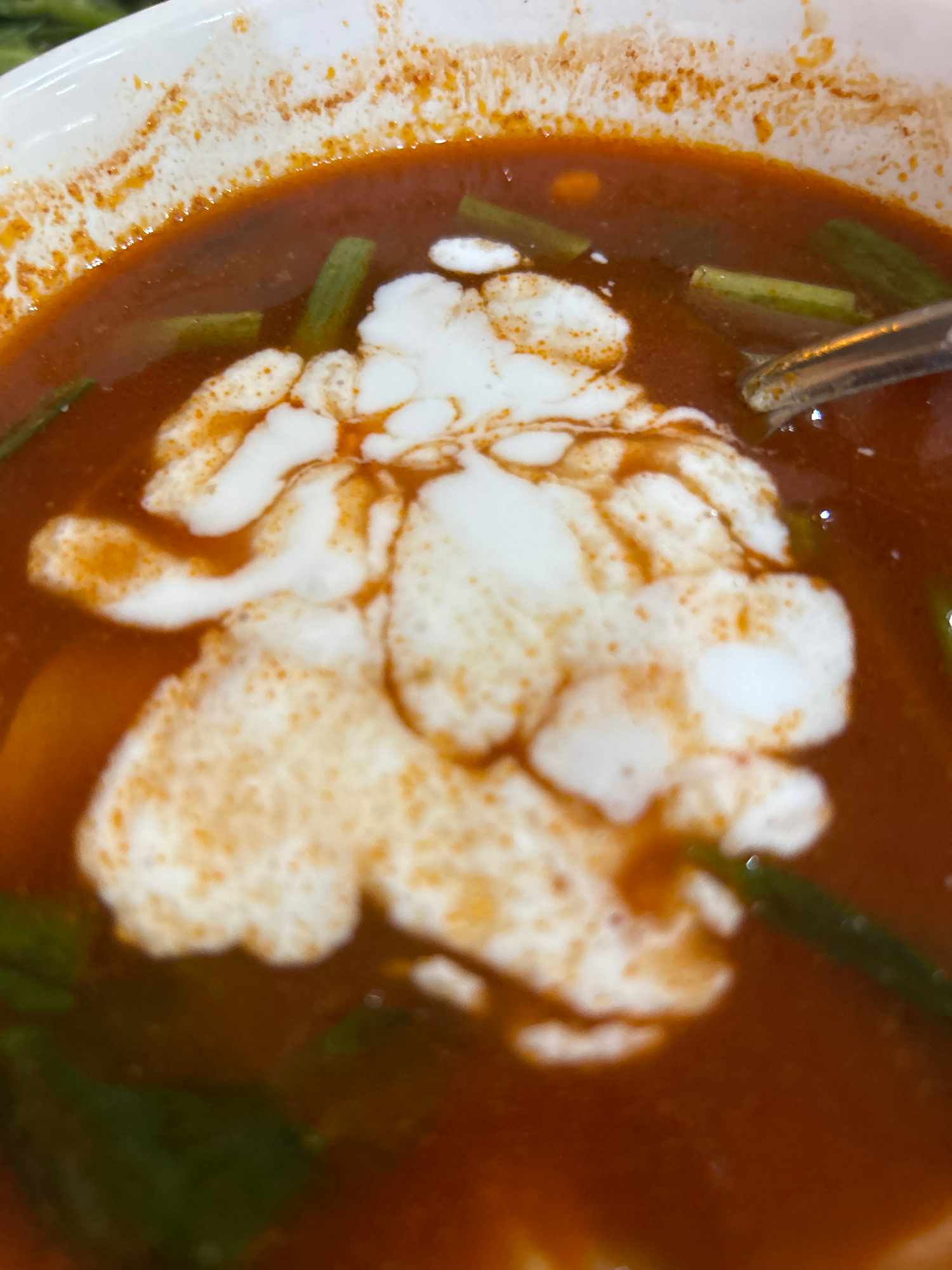 A close-up shot of a bowl of Vietnamese soup, potentially Bún cá Nha Trang, with a white swirl of topping (possibly coconut milk or cream) in the center. Green vegetable pieces are visible within the…read more