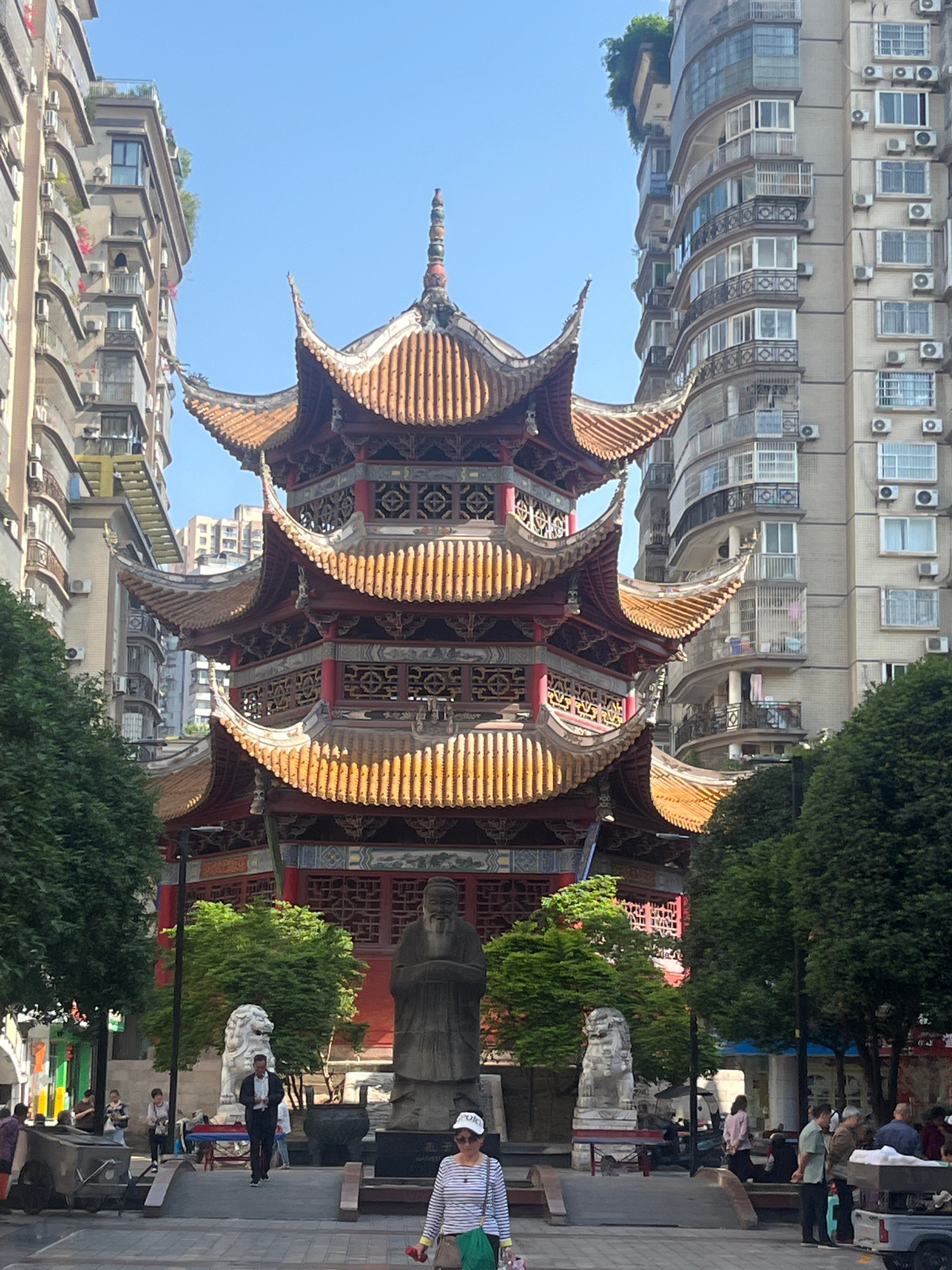 This image, taken in Jiangjin, China, features a prominent, ornate multi-tiered pagoda-style building at its center. The pagoda exhibits intricate traditional Chinese architecture with multiple upward…read more