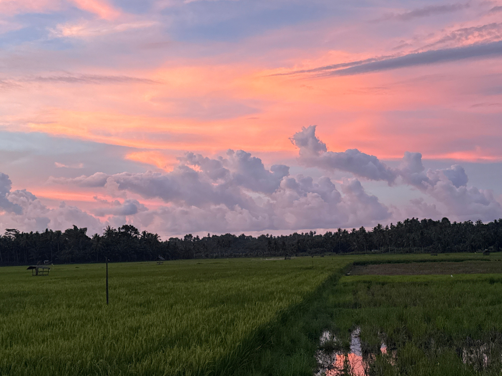 The image depicts a rural scene, likely in the vicinity of Lhokseumawe, Indonesia, given the prompt. In the foreground, there is a lush green rice paddy field stretching towards a treeline in the midg…read more