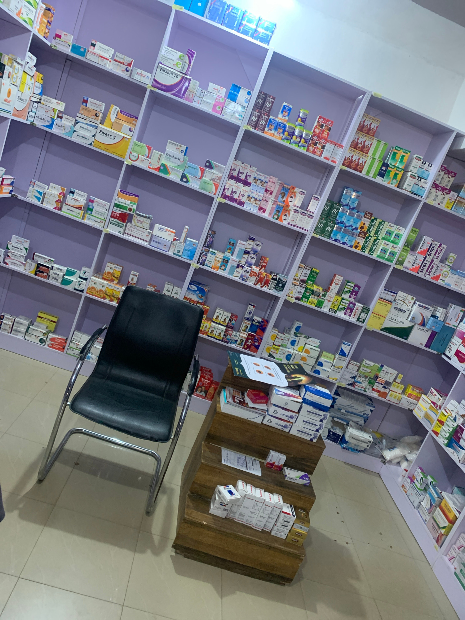 The image shows the interior of a pharmacy, likely located in Jos, Nigeria, based on the brands of medications on display. The shelves, painted a light purple, are densely stocked with various medicat…read more