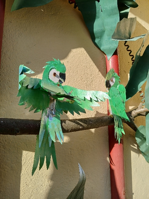 Two green parrot sculptures are mounted on a brown tree branch, positioned against a textured, light-yellow wall with a red trim. The upper parrot is smaller and perched, while the lower one is larger…read more