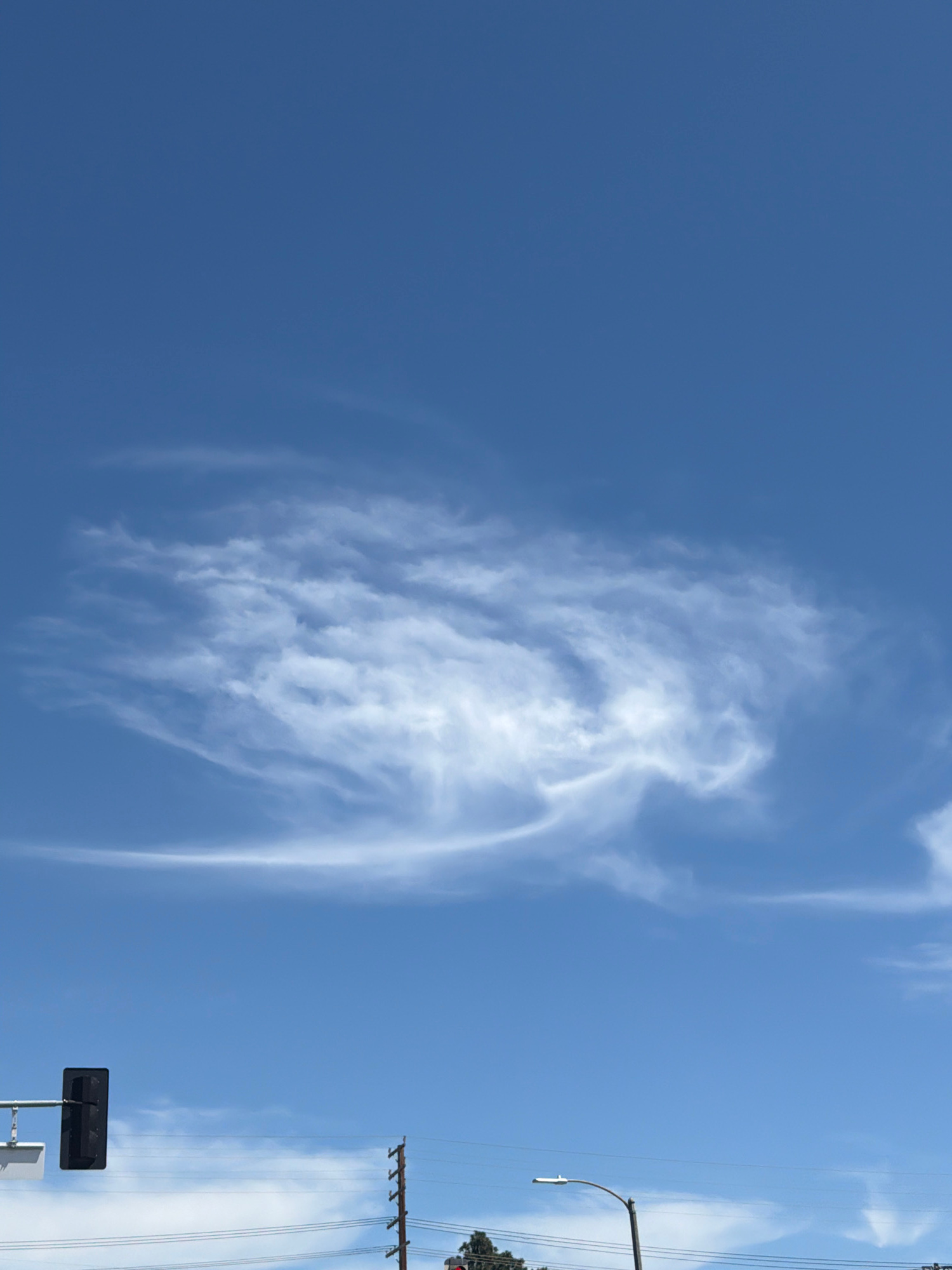 The image shows a vertical shot of a blue sky with cirrus clouds. On the right side of the frame, there is a street scene with utility poles and lines. A street light and a rectangular traffic signal…read more