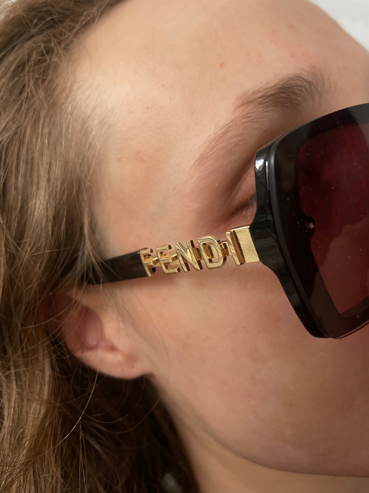 A close-up image shows a person wearing Fendi sunglasses. The sunglasses have a black frame and red lenses. The temple of the glasses is gold and spells out the brand name, "Fendi." The person has lig…read more