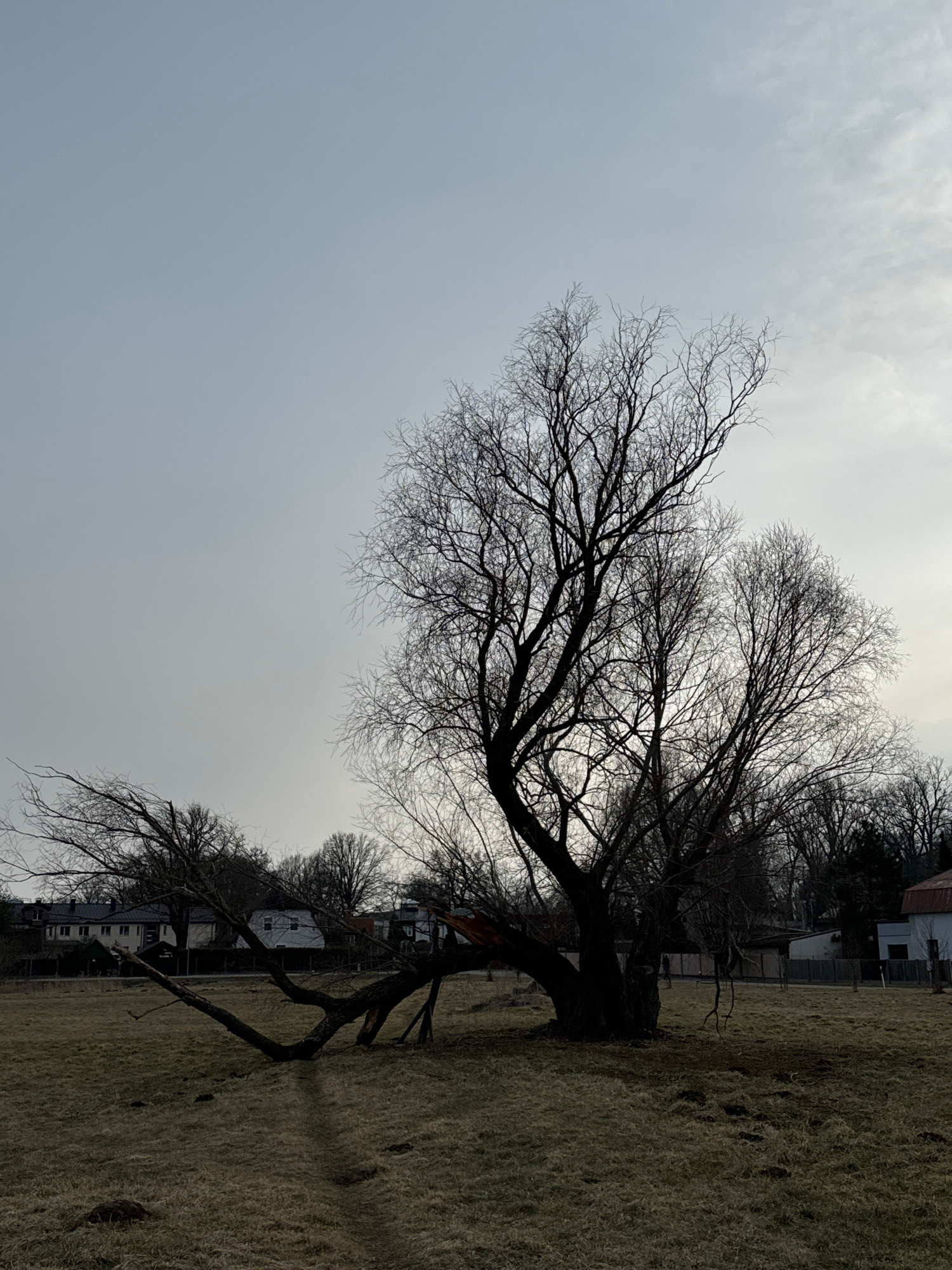 The image shows a barren tree silhouette against a grey, overcast sky, likely taken in Carnikava, Latvia, based on the provided metadata. The tree's trunk bends significantly, with several large branc…read more