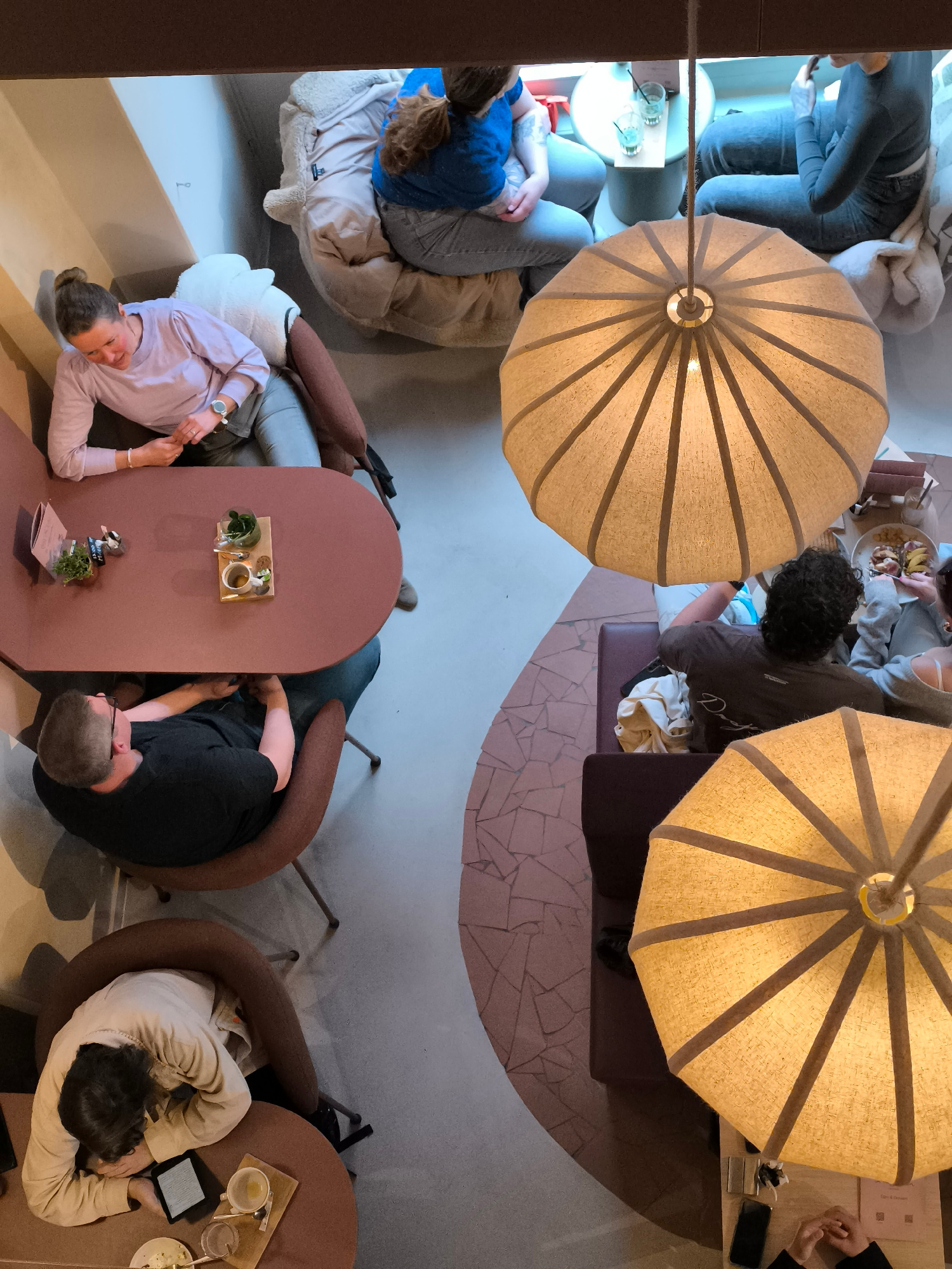 View from above of a café interior in Alkmaar, Netherlands. Several groups of people are seated at various tables. One woman in a light purple top is seated at a pink table with a man in a dark shirt.…read more