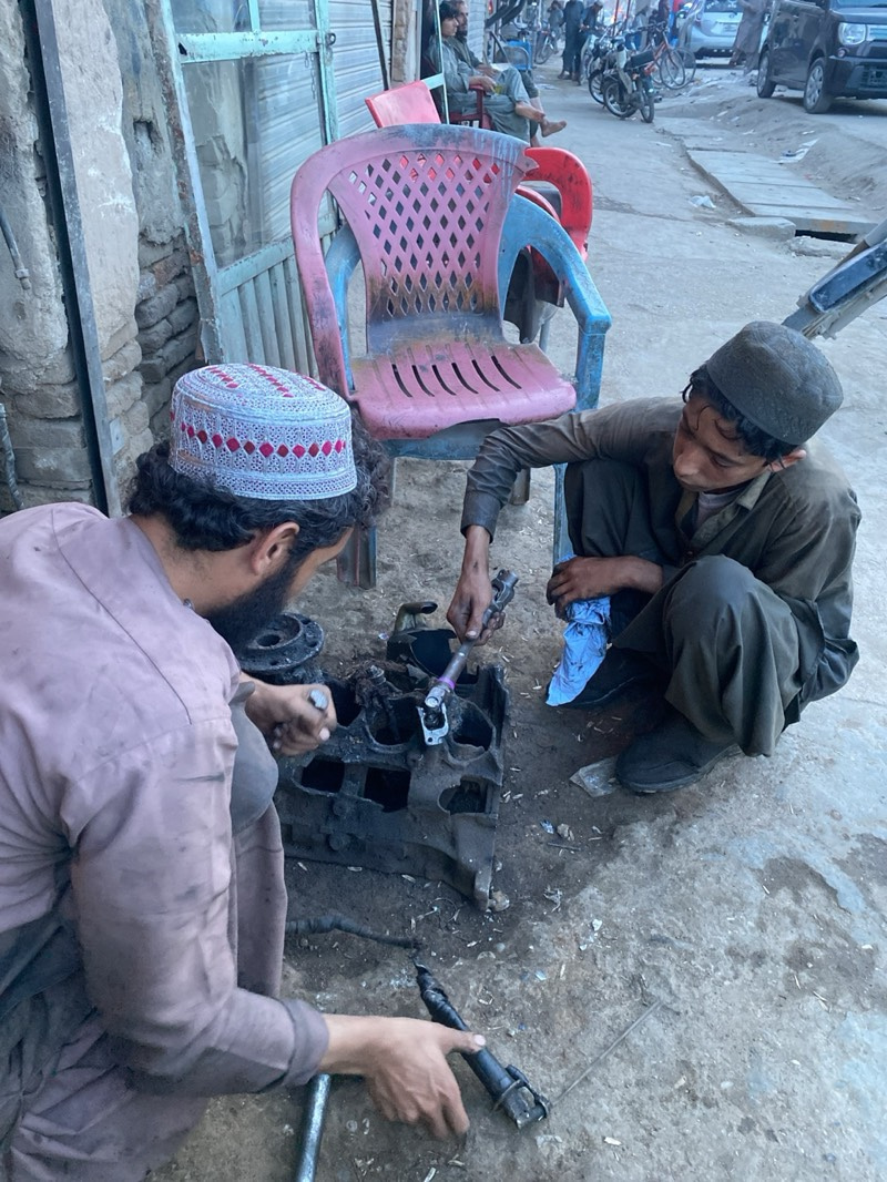 This medium eye-level shot captures a street scene in Kandahar, Afghanistan, focusing on two individuals engaged in repair work on a piece of machinery. In the foreground, two men, or possibly an adul…read more