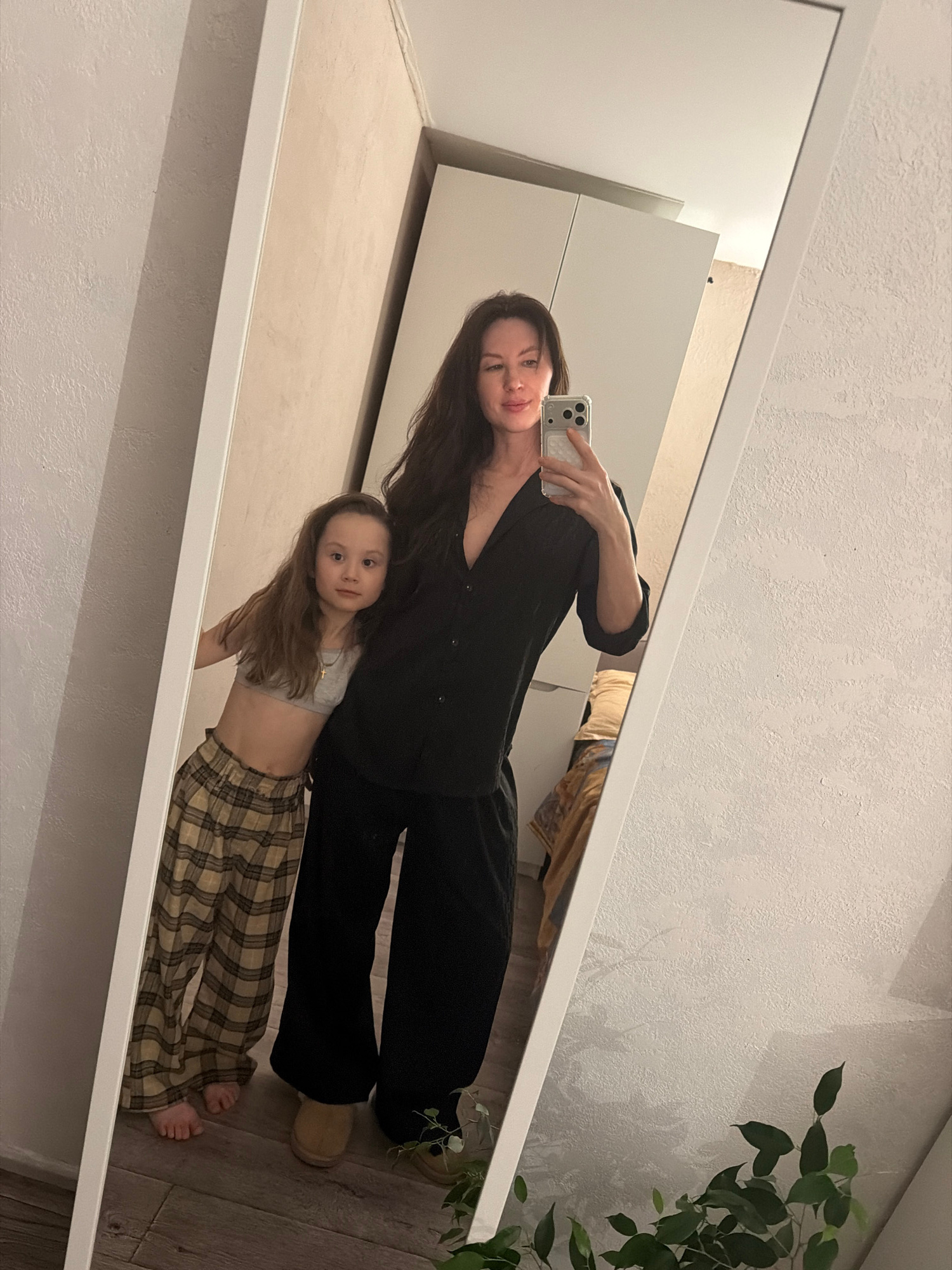 A woman with long dark hair wearing black clothes is taking a selfie with a young girl in a mirror. The girl has long brown hair and is wearing a light-colored top and plaid pants. The setting appears…read more