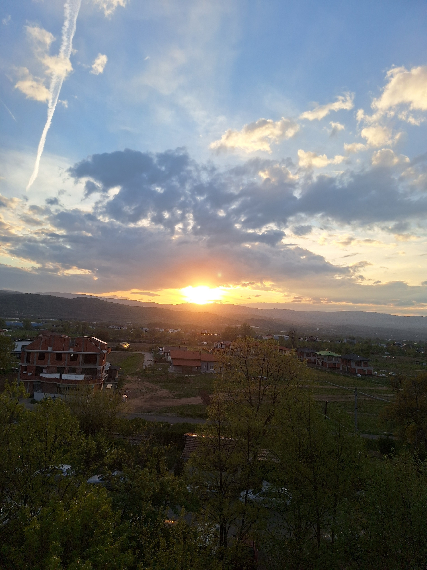 This panoramic image captures an outdoor landscape at either sunset or sunrise, overlooking the city of Blagoevgrad, Bulgaria. The scene is viewed from an elevated perspective, showcasing a blend of uā¦read more