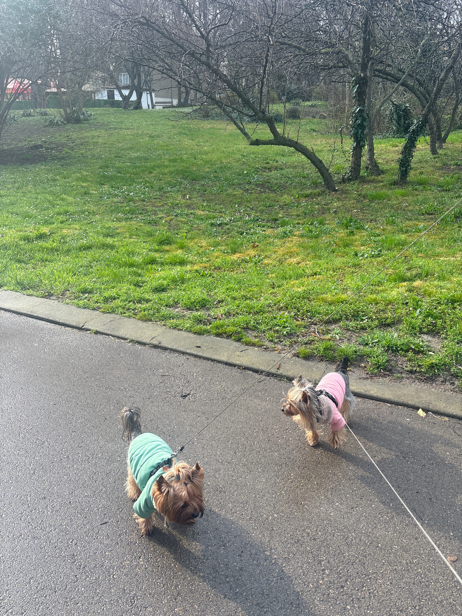 Two small, long-haired terrier-type dogs are on leashes on an asphalt path. One dog wears a pink coat; the other wears a mint green coat. The dogs appear to be sitting or standing still. A grassy area…read more