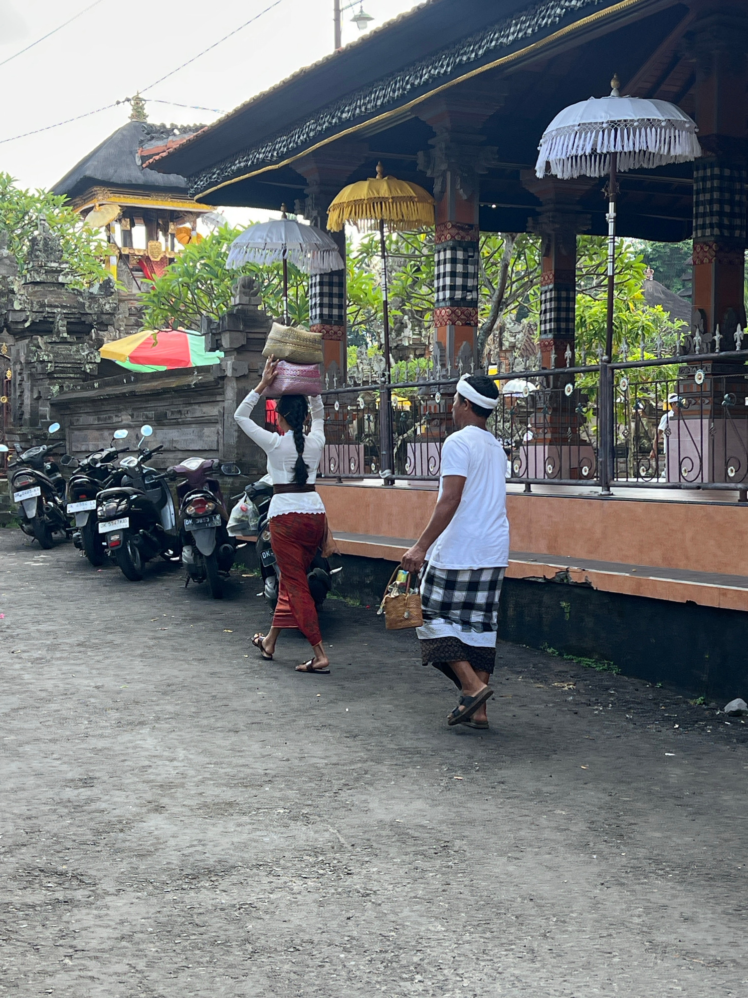 The image depicts a street scene in Singakerta, Indonesia. A man and a woman are carrying offerings, with the woman holding baskets on her head. The man is wearing a white shirt, a checkered sarong, a…read more
