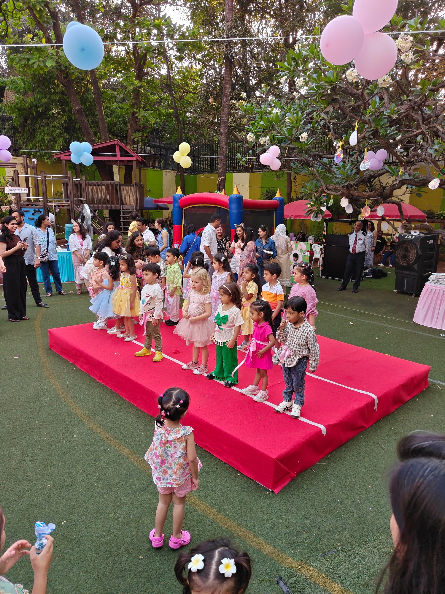 An outdoor children's event is depicted on a green artificial turf area, identified by a partially visible "Billabong High International School" sign in the background, indicating a location in Mumbaiβ¦read more