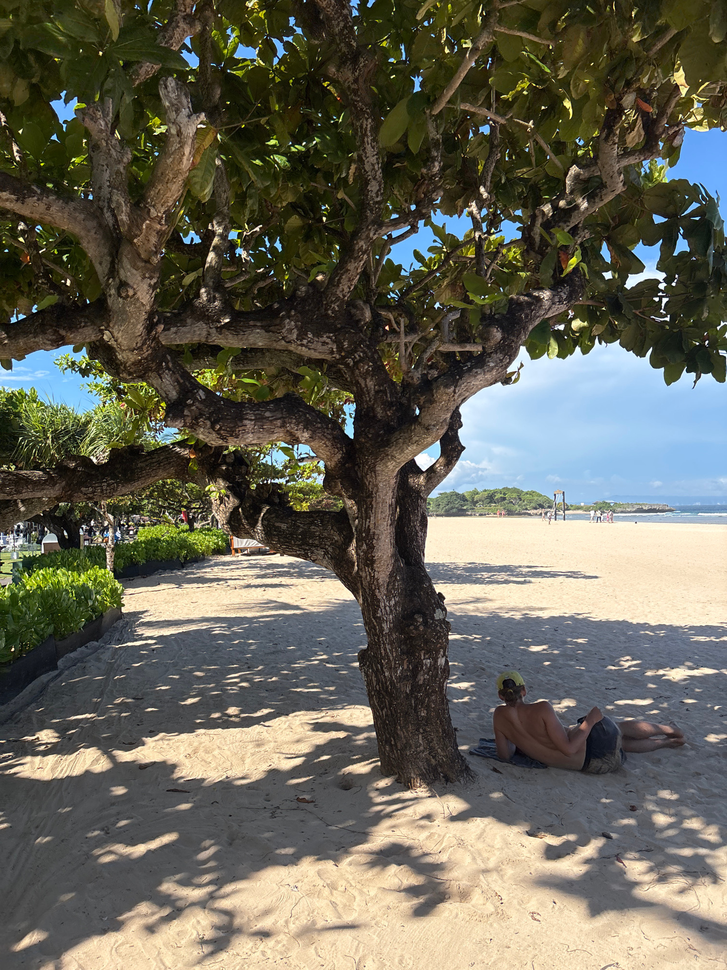A partially shaded beach scene is set in Nusa Dua, Indonesia. A gnarled tree with green foliage dominates the left side of the frame. Its branches extend over the sand. A man is lying on the beach in…read more