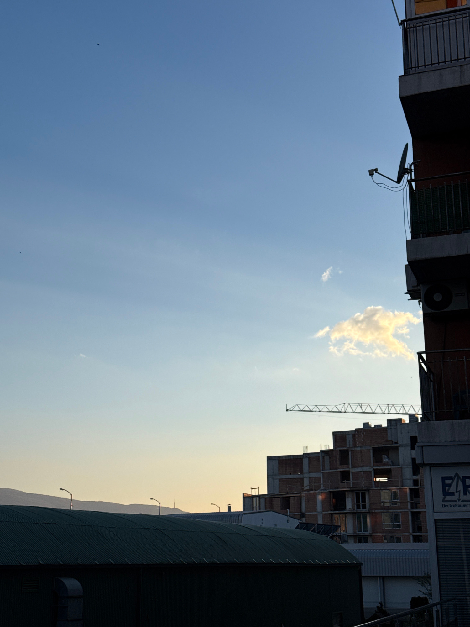 The image depicts an urban scene in Sofia, Bulgaria, focusing on the sky framed by buildings. The sky transitions from a light blue to a yellowish hue near the horizon, with a few scattered clouds. A…read more