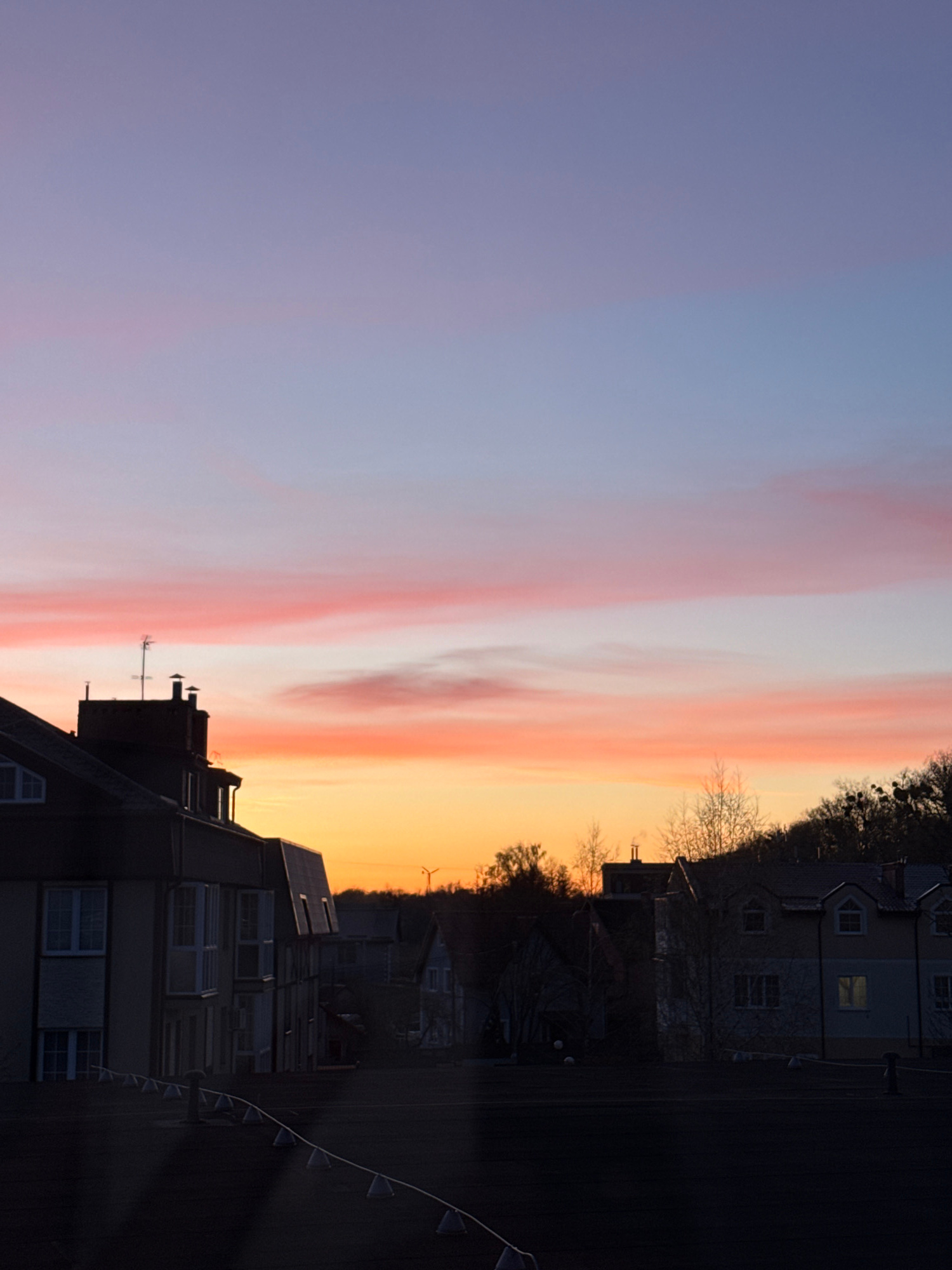 This image, set in Kaliningrad, Russia, captures a vivid sunset or sunrise over an urban environment. The sky dominates the left side (when viewed correctly, rotated counter-clockwise), displaying a s…read more