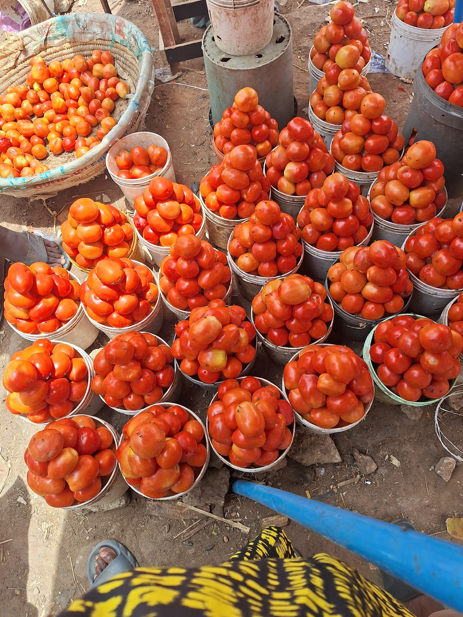 The image shows a tomato market in Maiburiji, Nigeria. Numerous white plastic buckets filled to the brim with ripe red tomatoes are arranged in rows on the ground. A large woven basket, also overflowi…read more