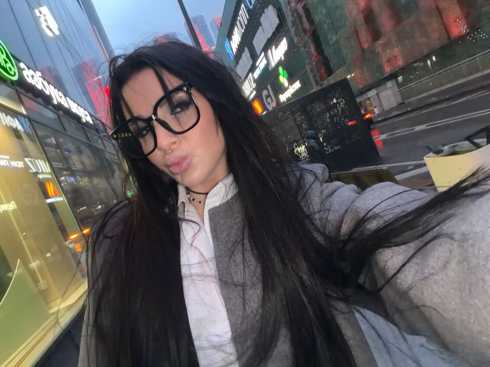 A medium-shot selfie shows a woman with long black hair, wearing large, dark-rimmed glasses, a white collared shirt, and a gray jacket, posing with pursed lips. The background suggests an urban enviro…read more