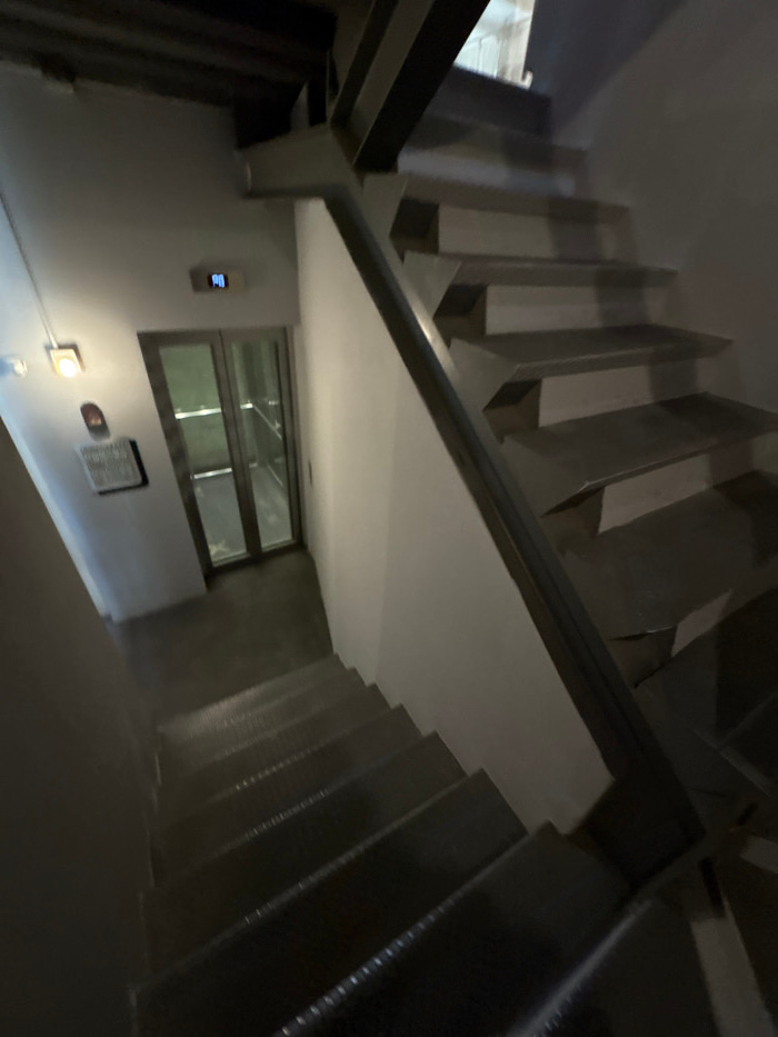 A low-angle shot depicts a stairwell. Metal stairs rise on both sides of the frame. A wall with a window is visible on the left, featuring an electronic device and some fixtures. The image exhibits a…read more