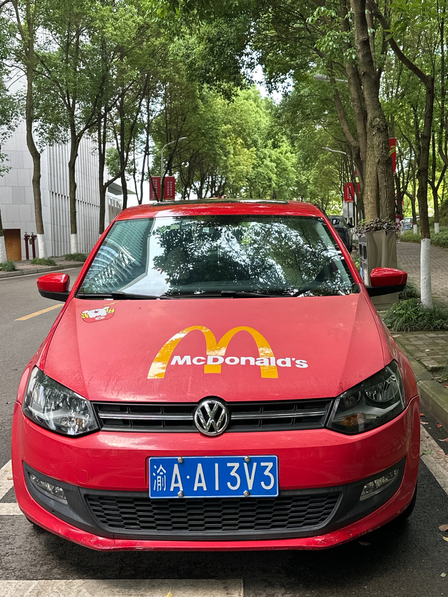 A red Volkswagen is parked on the side of a road. A McDonald's logo is prominently displayed on the hood of the car. The car has a blue license plate with the characters 渝A·A13V3. Based on the license…read more