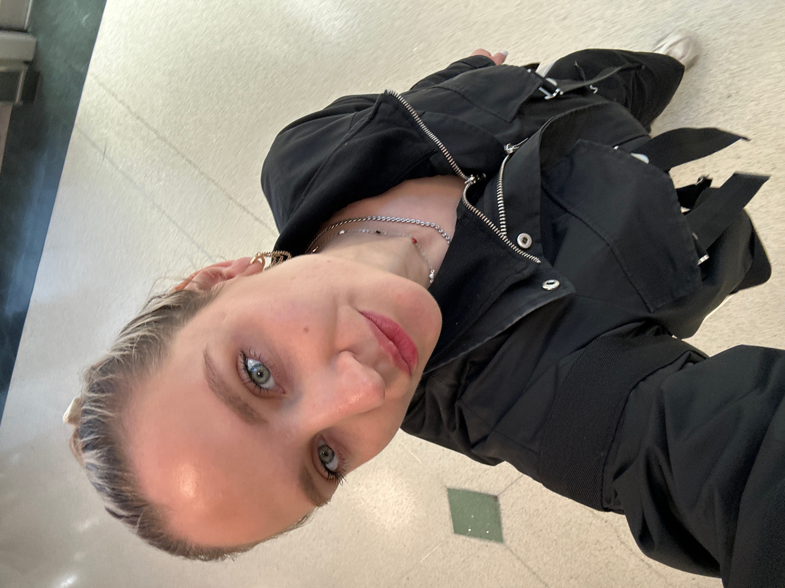A selfie taken from a low angle, shows a young woman with blonde hair and green eyes looking into the camera. She is wearing a black jacket over black pants. The background consists of a light-coloredβ¦read more